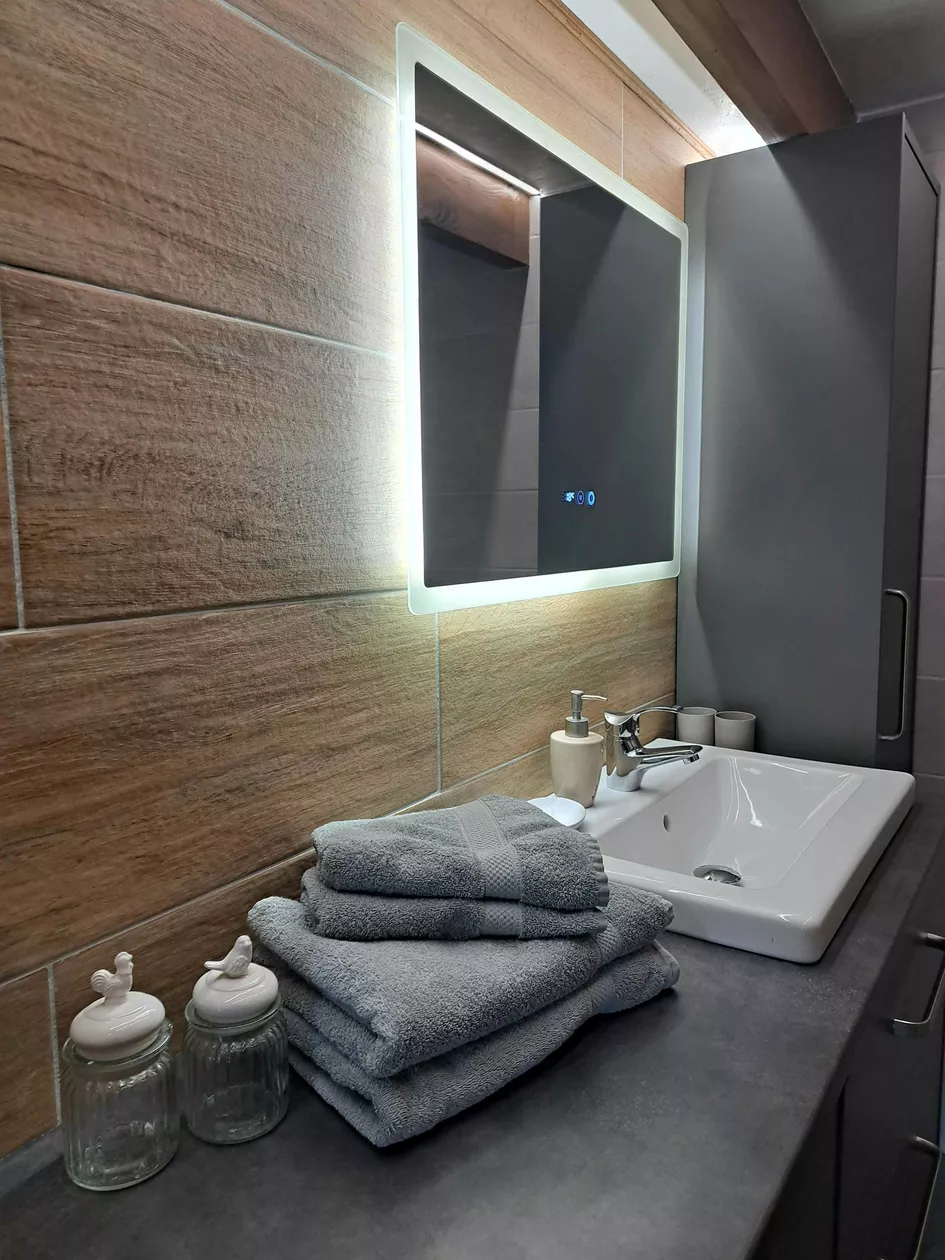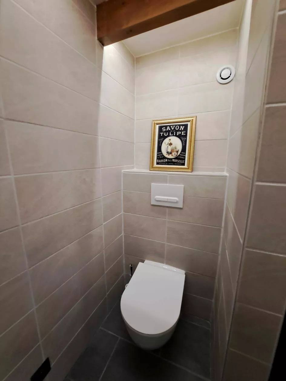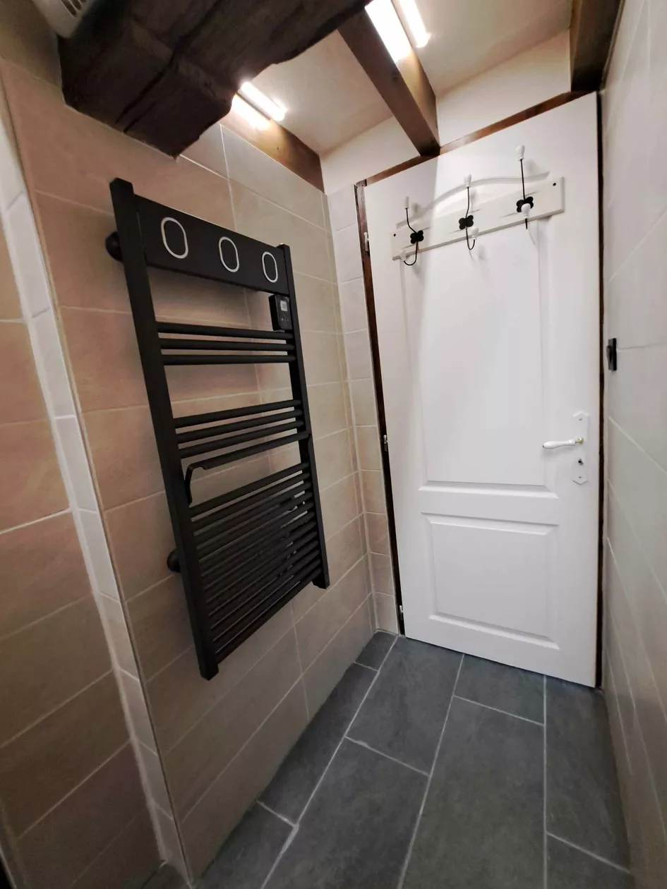 Er zijn 2 slaapkamers (1 bed 1.60 m x 2.00 m ,1 bed 1.60 m x 2.00 m) en1 mezzanine (1 bed 1.60 m x 2.00 m) en 2 badkamers, 1 op het gelijkvloers en 1 op de bovenverdieping met wastafel, douche en toilet. Wasmachine en droogkast ter beschikking.