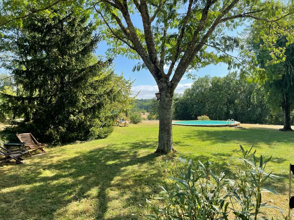 Aan de zuidkant is een terras met een weids uitzicht over een heuvelachtig landschap, door sommigen beschreven als “paradijselijk”, vanwege de absolute rust en ruimte. Het zwembad, dat door zijn ronde vorm en natuurstenen rand in het landschap lijkt op te gaan, is gevuld met gezuiverd Dordognewater. Behalve een parasol, biedt de nabijheid van bomen bescherming tegen de zon, die hier 's zomers fel kan zijn