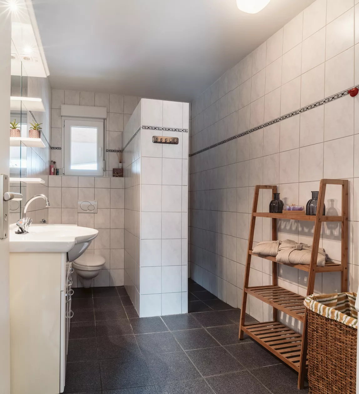 De comfortabele badkamer is uitgerust met een inloopdouche, een wastafel en een toilet. Daarnaast is er bij de ingang een apart toilet aanwezig.