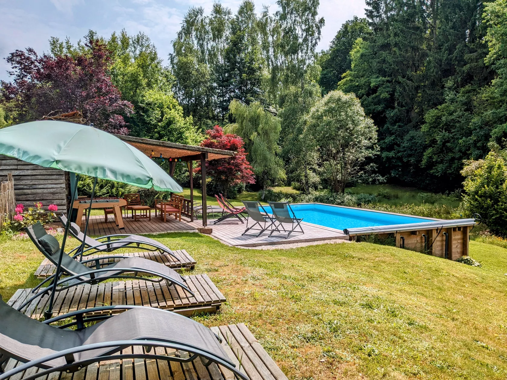 Verwarmd zwembad met natuurlijke filtratie, chiliennes en ligstoelen rondom, uitzicht op de bergen, een hoekje van het paradijs!