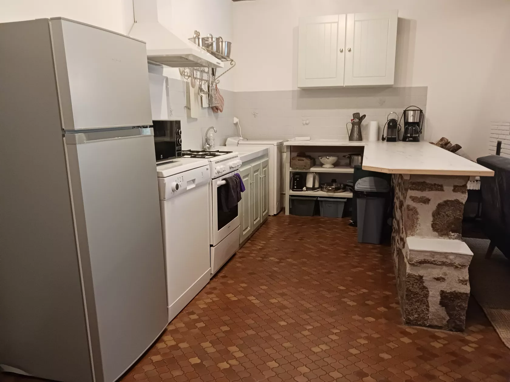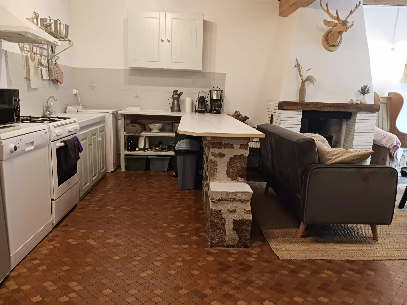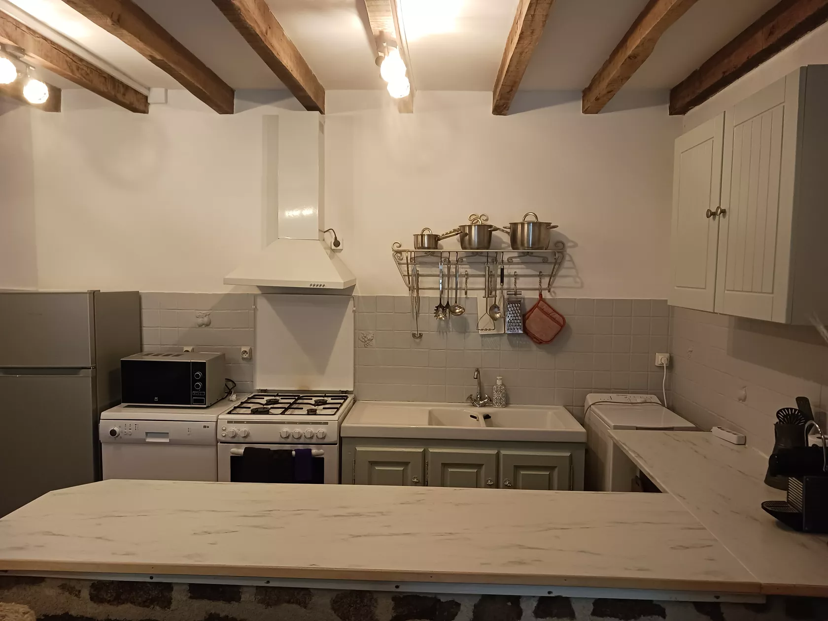 Gîte Laine heeft een woonkamer met een gezellige houtkachel, de keuken is volledig uitgerust met een gasfornuis, gasoven, magnetron, koelkast/vriezer, vaatwasser, wasmachine en zowel een Nespresso als filter-koffieapparaat.