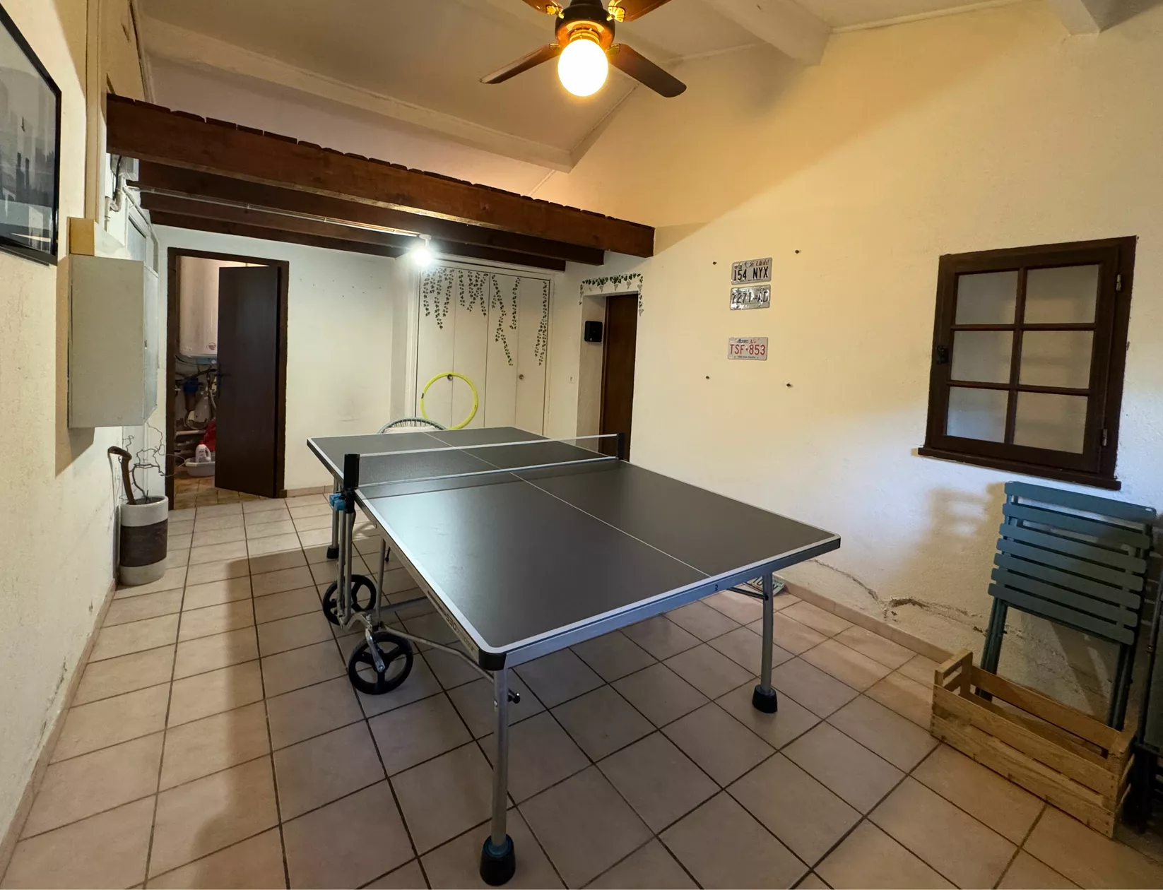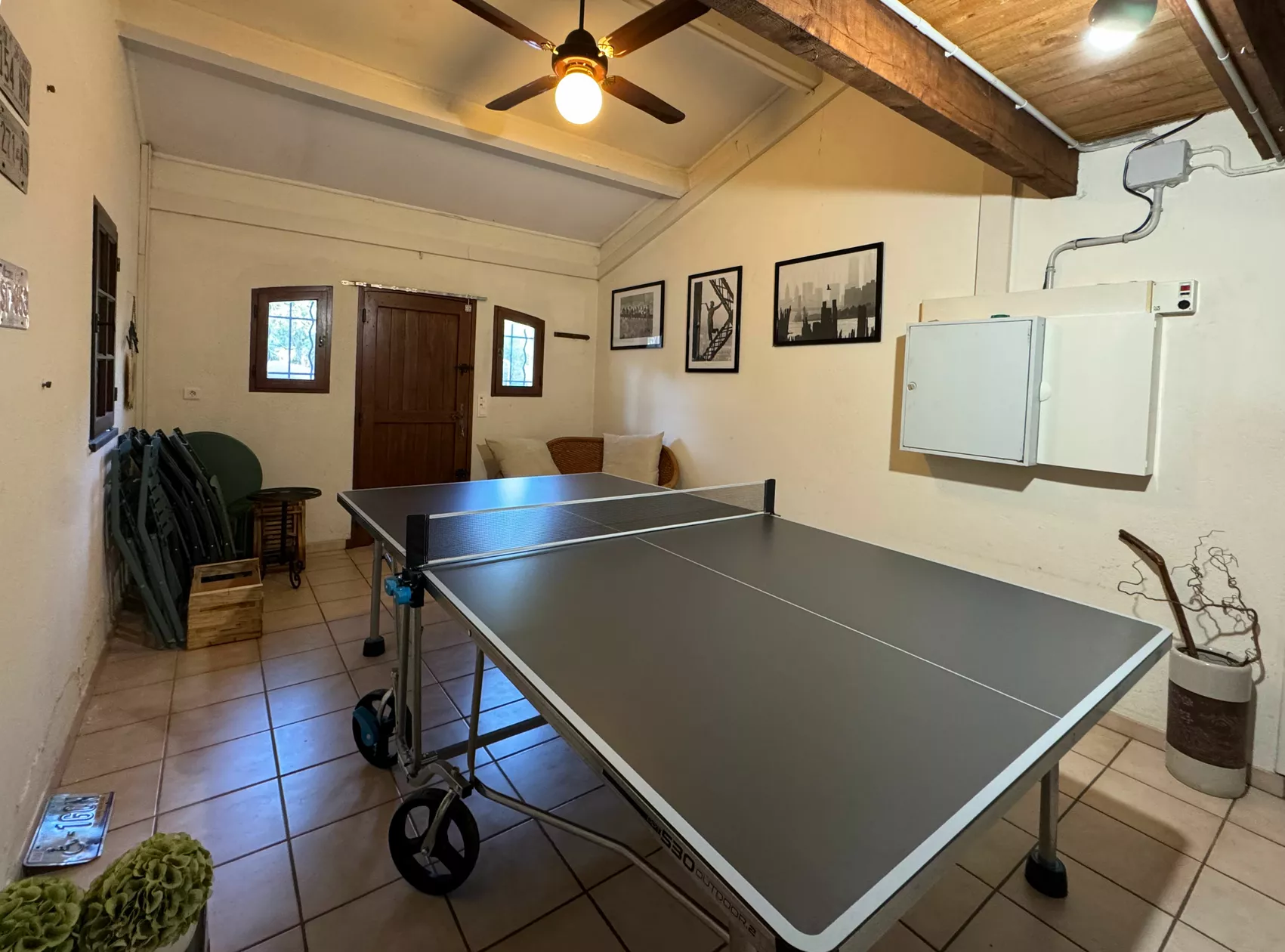 Er is een bijkeuken met een waterontharder, een wasmachine en zonodig een extra koelkast. Vanaf hier is er toegang tot een speelkamer met een tafeltennistafel (die ook buiten gebruikt kan worden). Hier staan ook 2 kinderstoelen en 2 middelgrote stoelen voor kinderen.