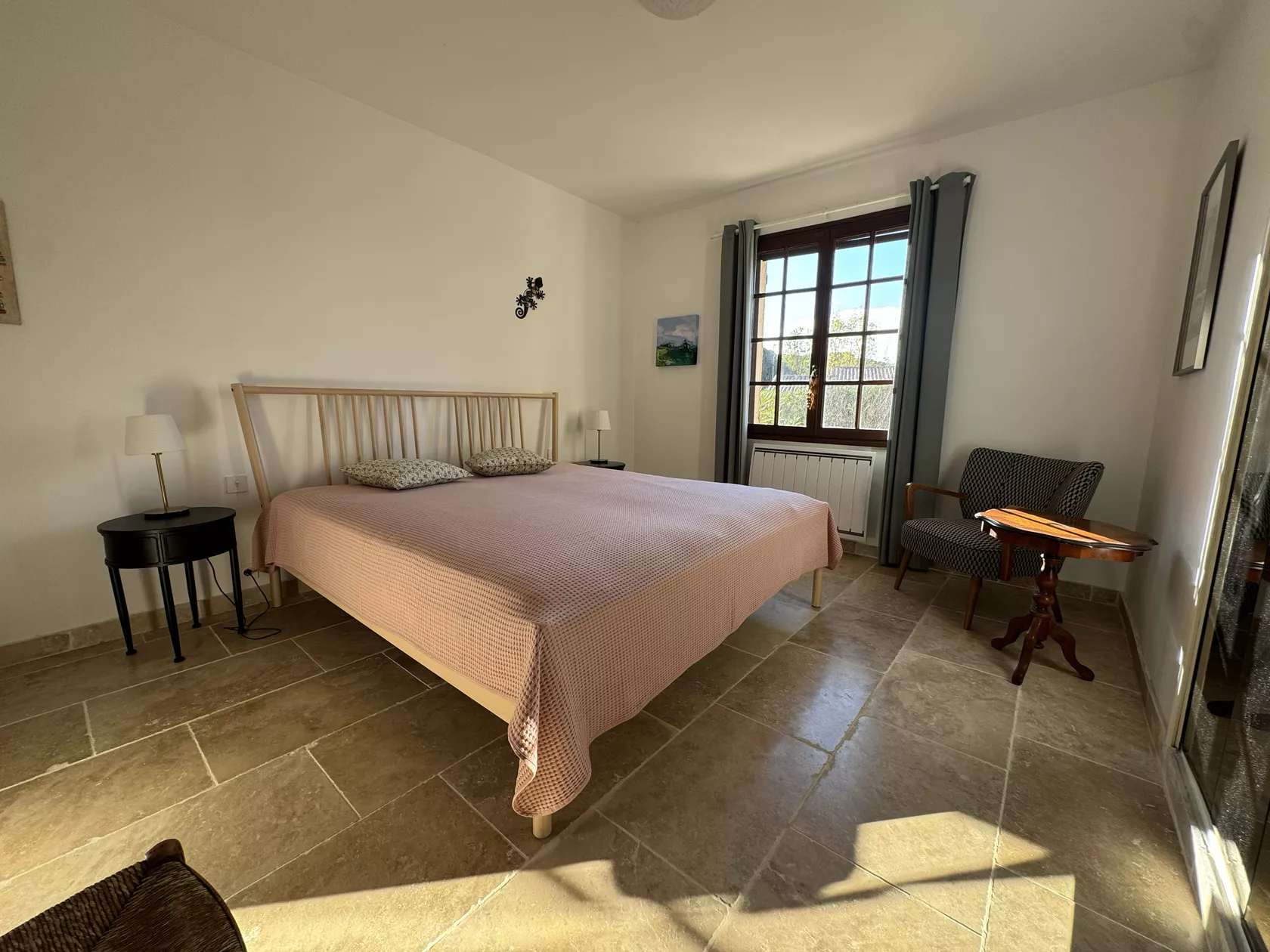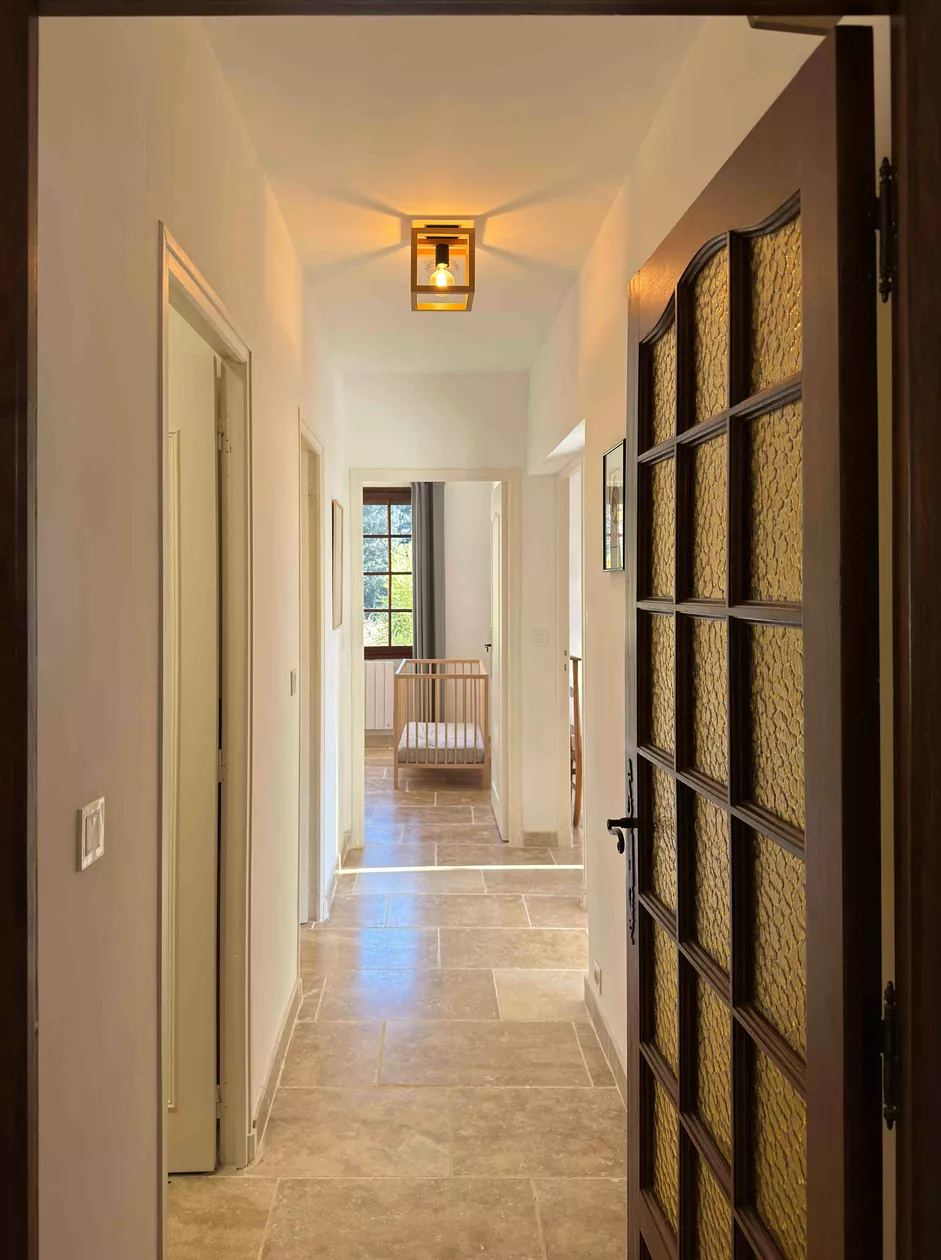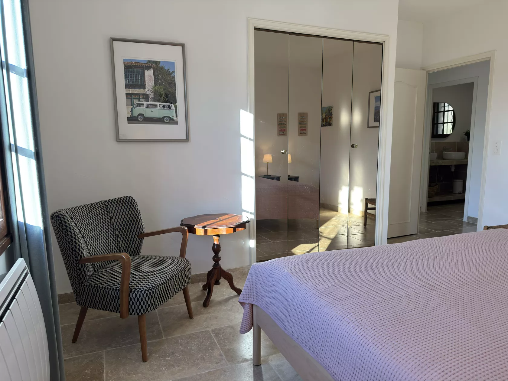 De open trap leidt naar een mezzanine met een tweede zithoek met boekenkast. Daarnaast is de 4e ruime slaapkamer met een 2-persoonsbed (180x200m), een badkamer ensuite met een ruime inloopdouche en een prachtig uitzicht richting de Maures.