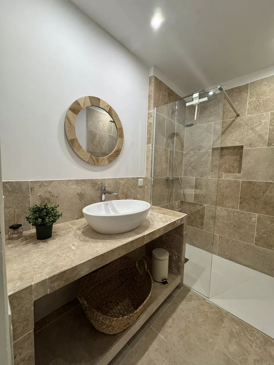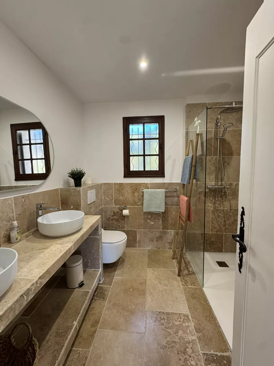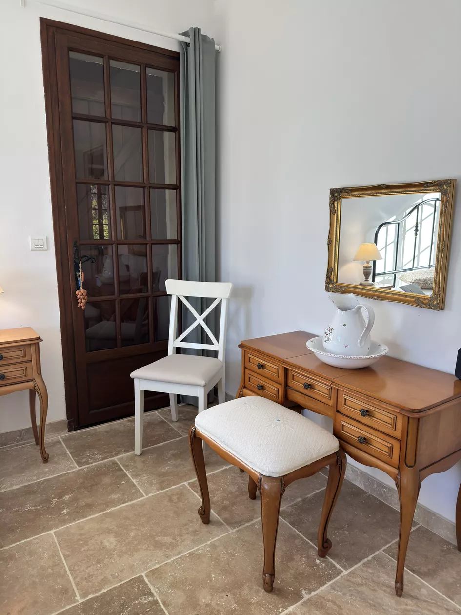 De open trap leidt naar een mezzanine met een tweede zithoek met boekenkast. Daarnaast is de 4e ruime slaapkamer met een 2-persoonsbed (180x200m), een badkamer ensuite met een ruime inloopdouche en een prachtig uitzicht richting de Maures.