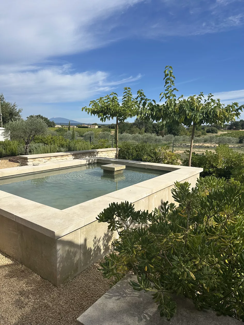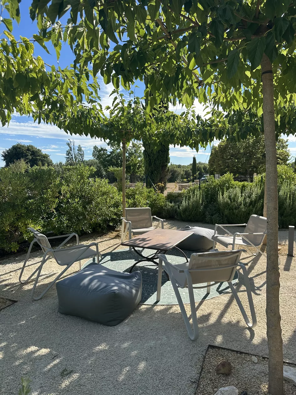 De tuin kreeg een extra bassin (van 4 op 5m, 60cm diep - ideaal voor gezinnen met kleine kinderen) en heeft zijn eigen 'coin d'apero' of lounge hoek onder de moerbeibomen en een plancha op gas.