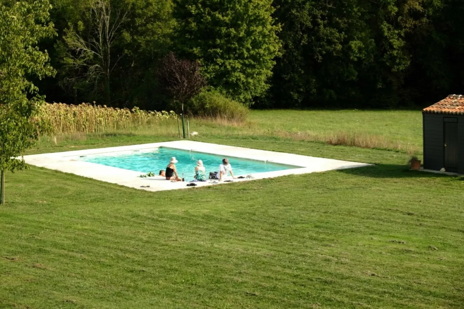 Tegenover de hoofdingang vindt u een romantische, ommuurde cuisine d'été met kruidentuin, een grote eettafel onder een blauweregenpergola en een barbecue. Het zwembad is recent omheind voor extra veiligheid voor kinderen en huisdieren. Op het terrein is ruime parkeergelegenheid aanwezig.