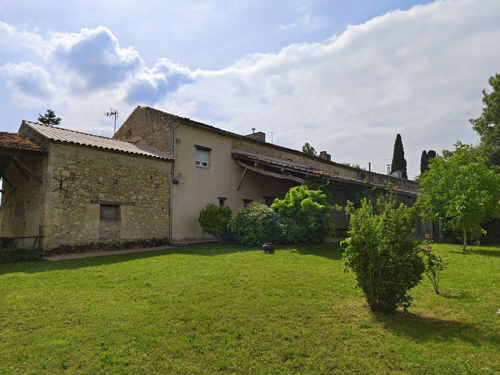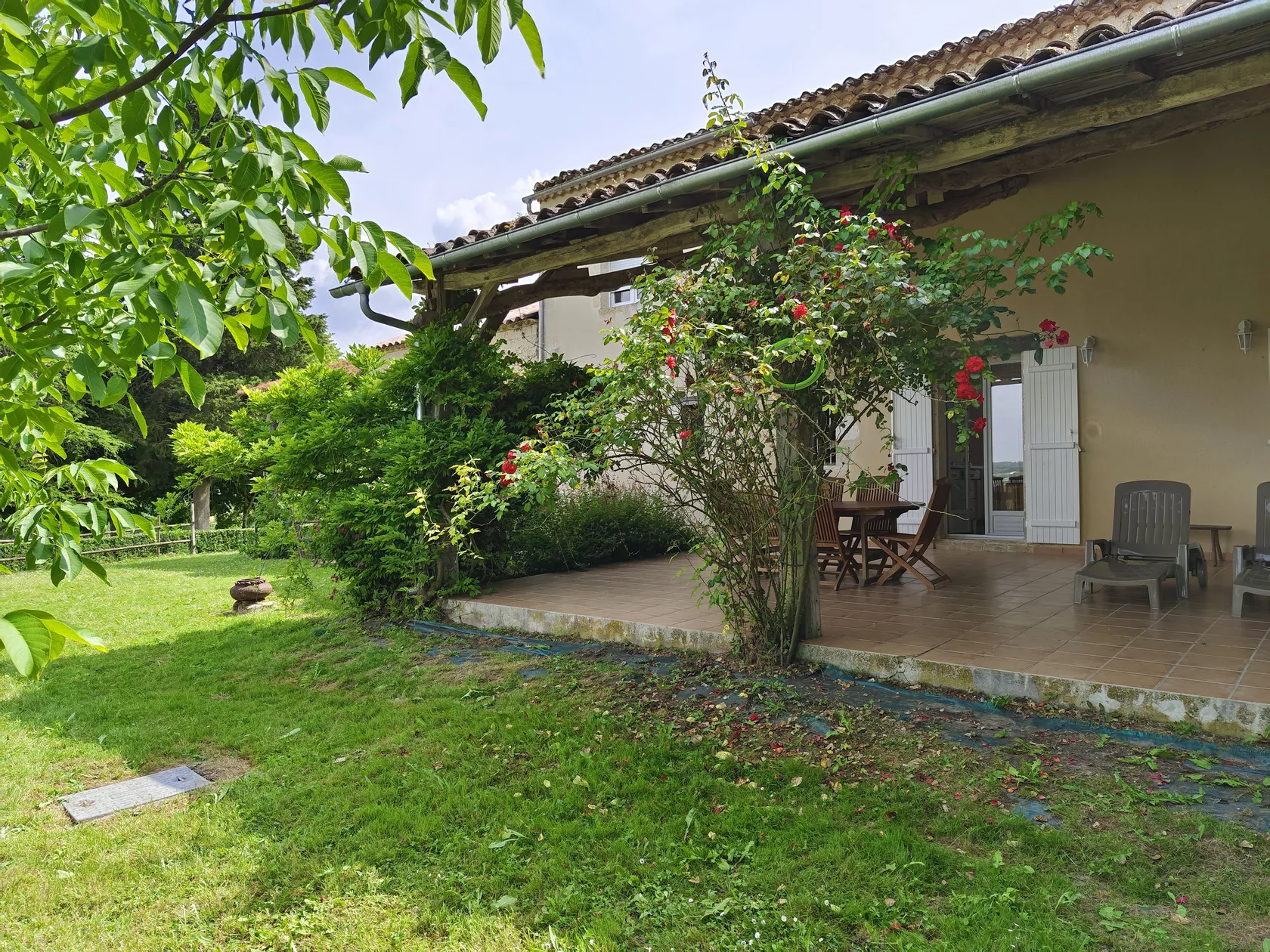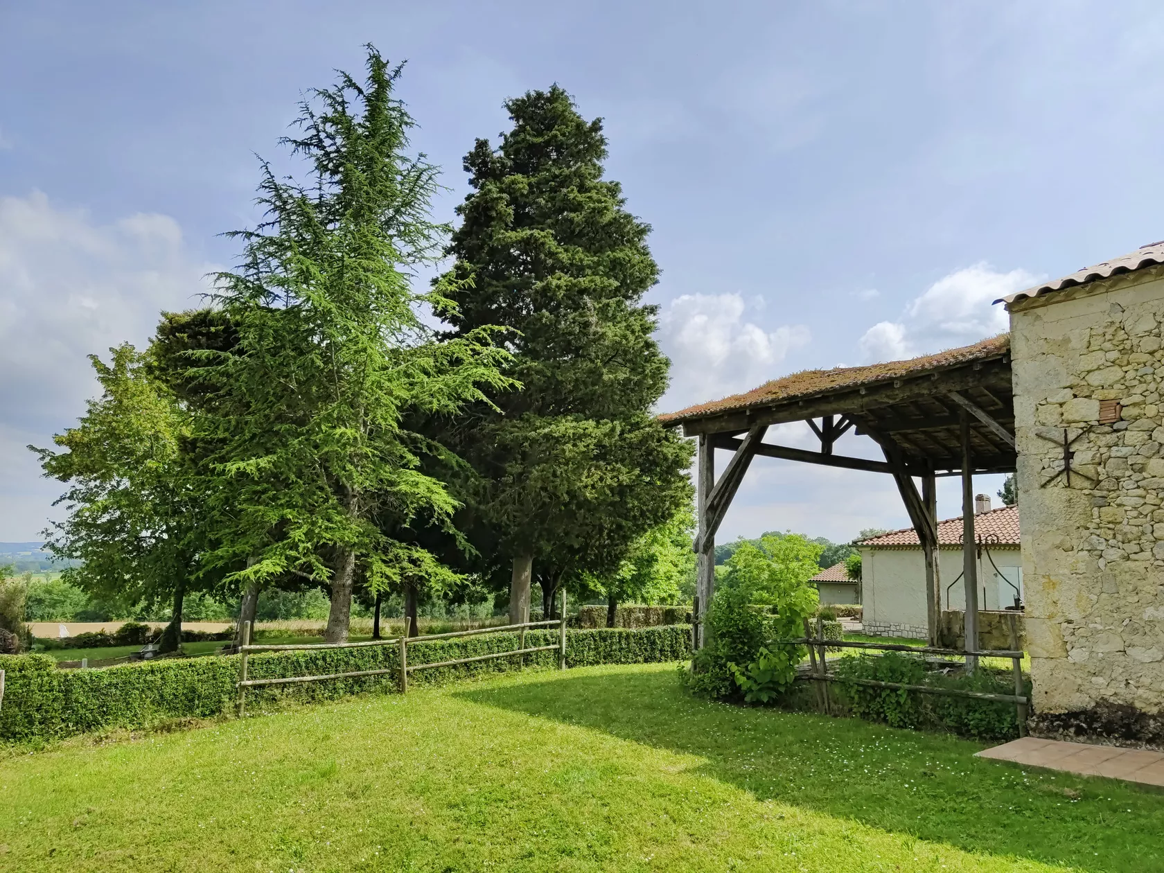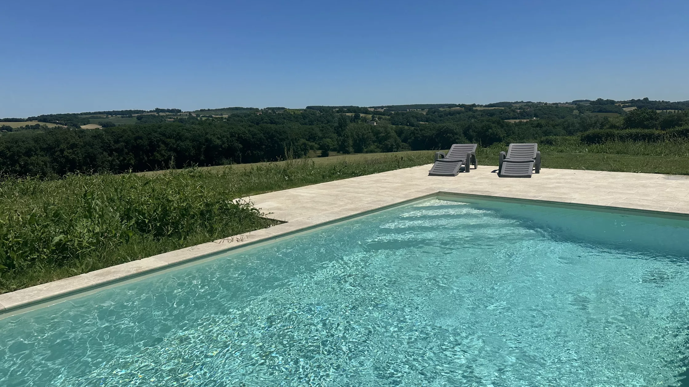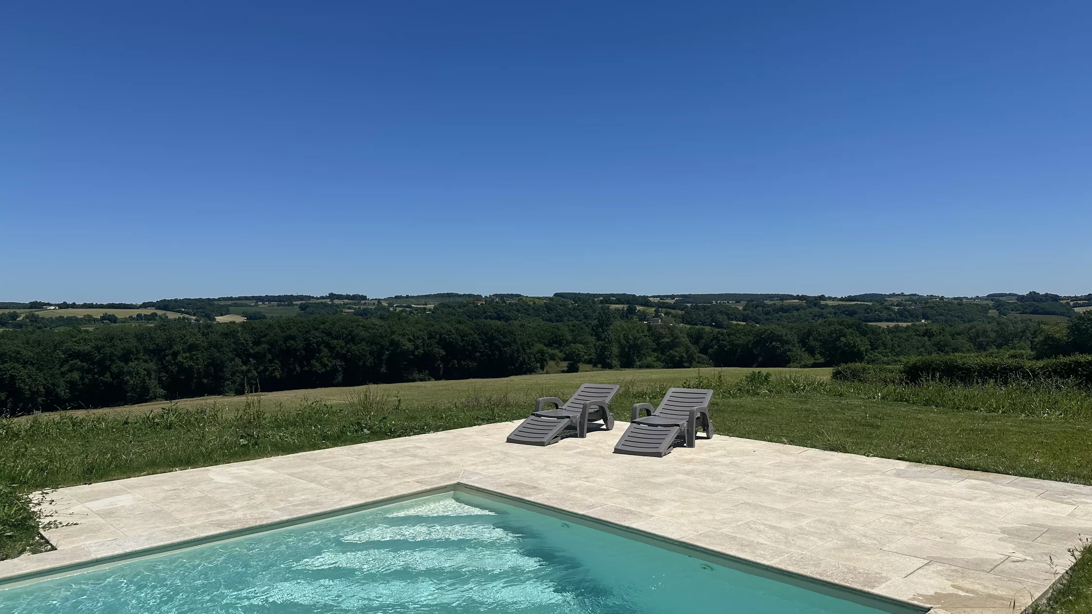 Er zijn 2 ruime slaapkamers met badkamer in het oude deel, hieronder de leefruimte, eetkamer en een modern uitgeruste keuken. Vanuit de keuken en leefruimte hebben we toegang tot een groot overdekt terras met een prachtig uitzicht op het nieuwe zwembad en het prachtige landschap van de Gers, met zijn glooiende heuvels, graan, mais of zonnebloemvelden. In de verte uitzicht op 2 kastelen en het silhouet van La Romieu, een van de mooiste dorpen van het Gers.