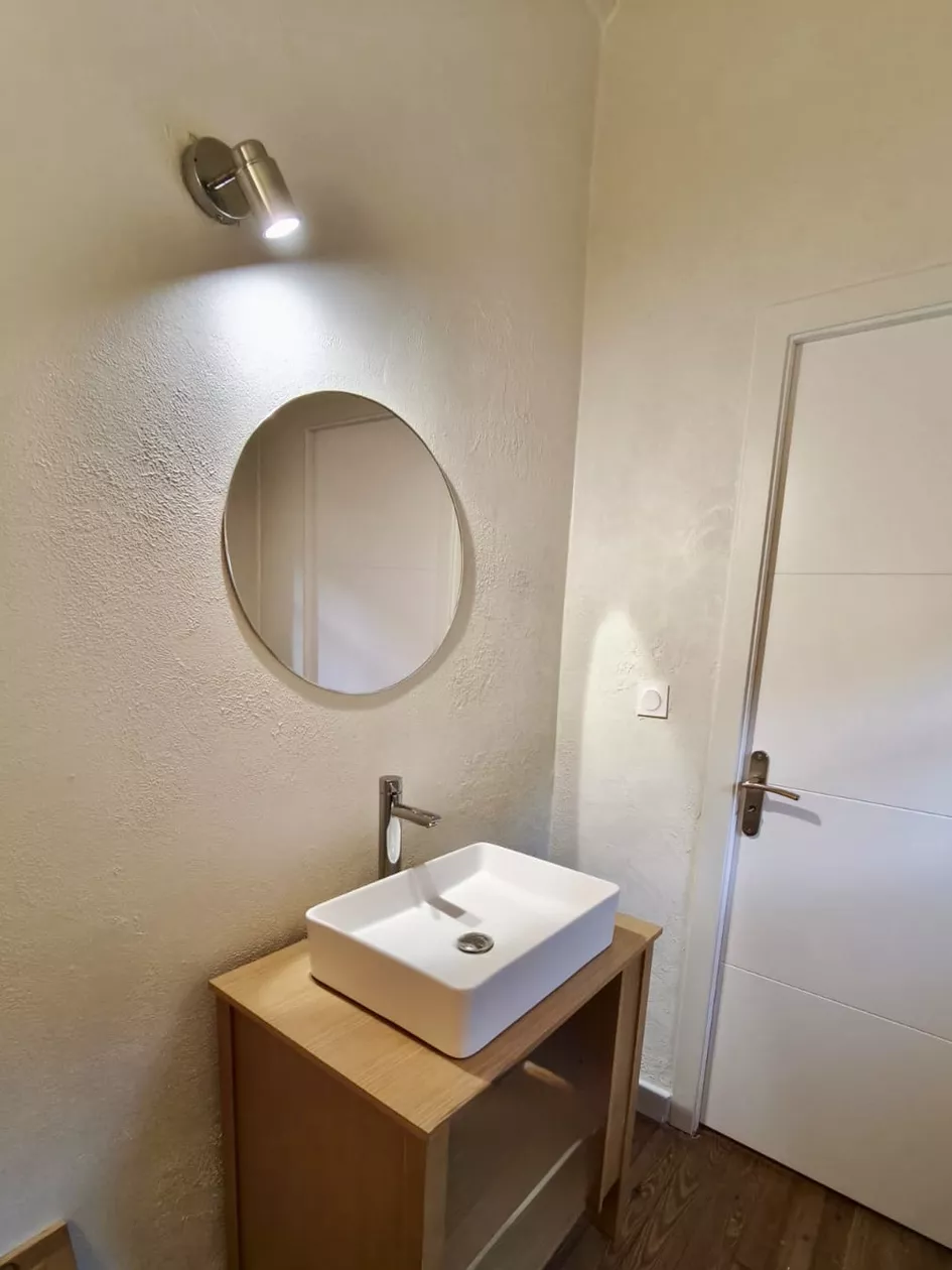 Daarnaast is er een kleine badkamer met toilet en ruime wastafel.