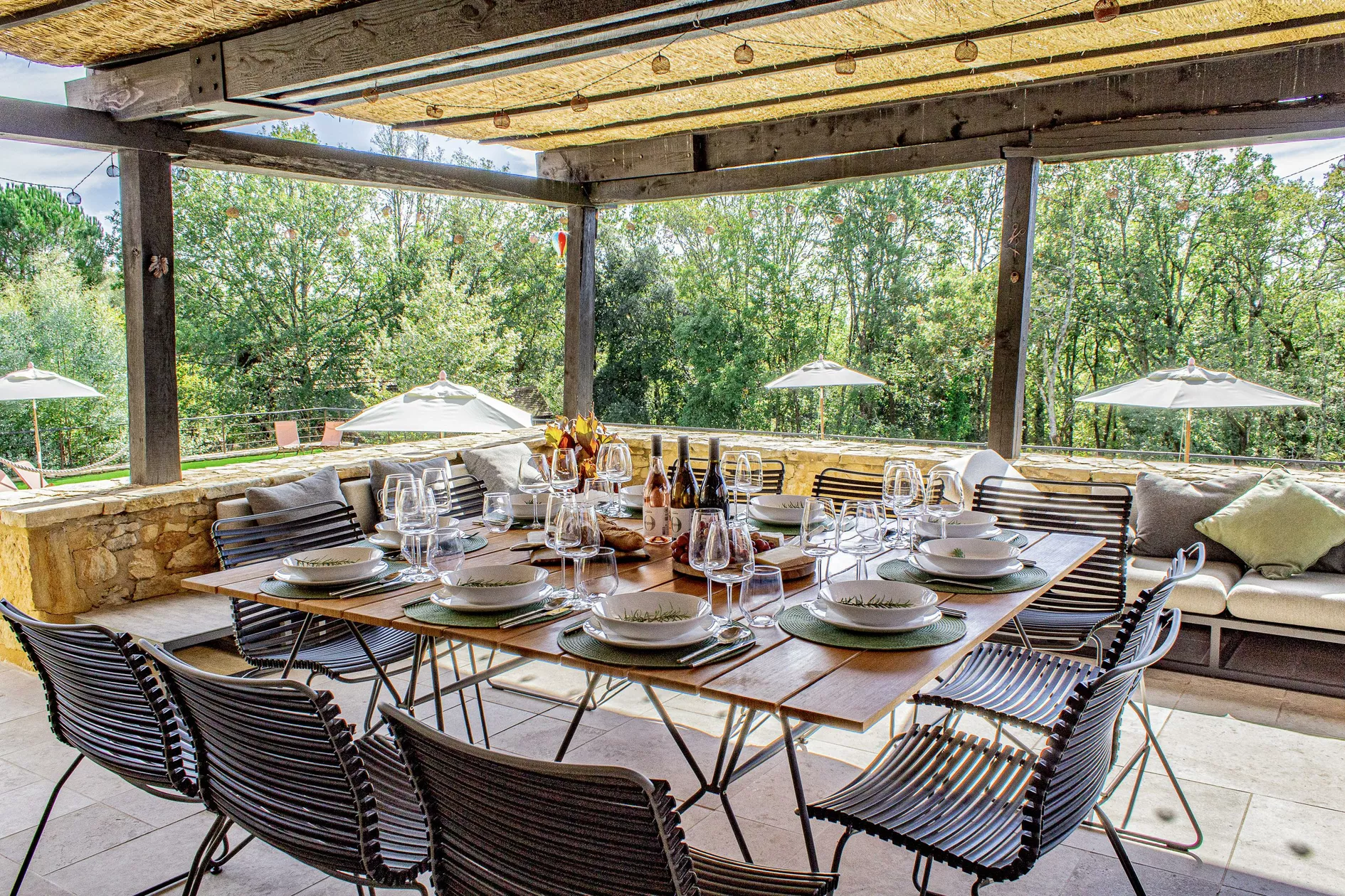 Stap naar buiten en je wordt begroet door je eigen zonovergoten terras, in de schaduw van jasmijnbomen en met ononderbroken uitzicht over de beboste vallei. Of je nu koffie drinkt bij zonsopgang of geniet van een glas wijn op het gouden uur, het tafereel voor je is een constante uitnodiging om stil te staan en adem te halen.