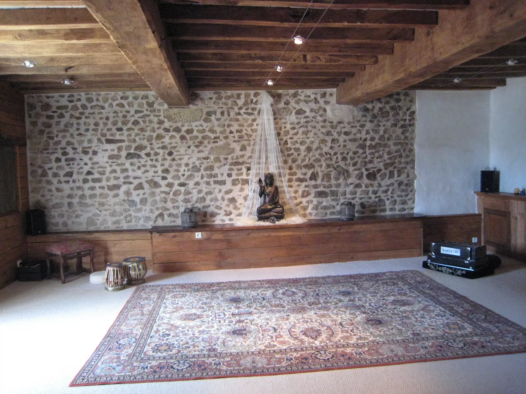 Deze cursusruimte is voorzien van vloer verwarminng, airco en een dertigtal meditatiekussentjes.