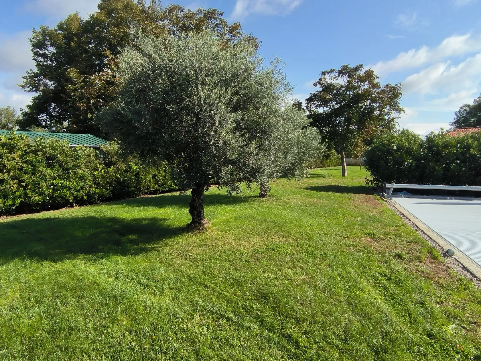 De grote schuifpui komt uit op het enorme terras met loungebank. Het hoger gelegen terras heeft een overkapping, een grote eettafel met stoelen en een barbecue met uitzicht op het zwembad van 3x12m. Er zijn ligbedden op het zwembadterras. Rond het zwembad is een grote, volledig omheinde tuin.