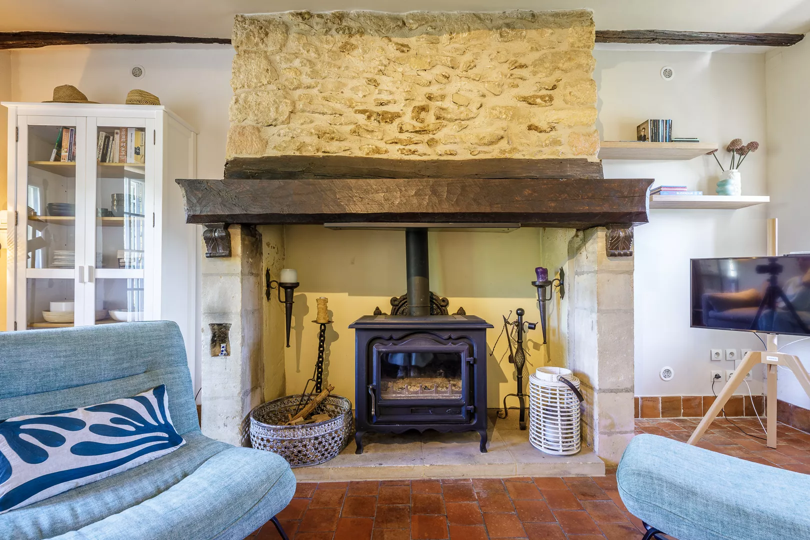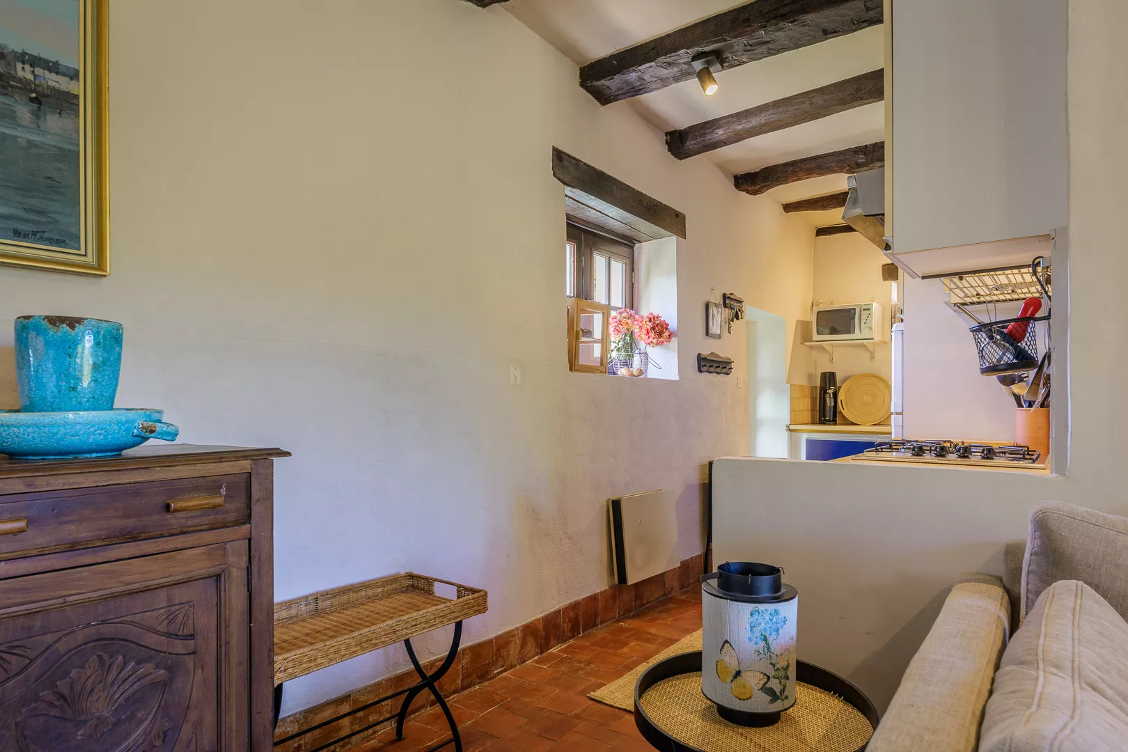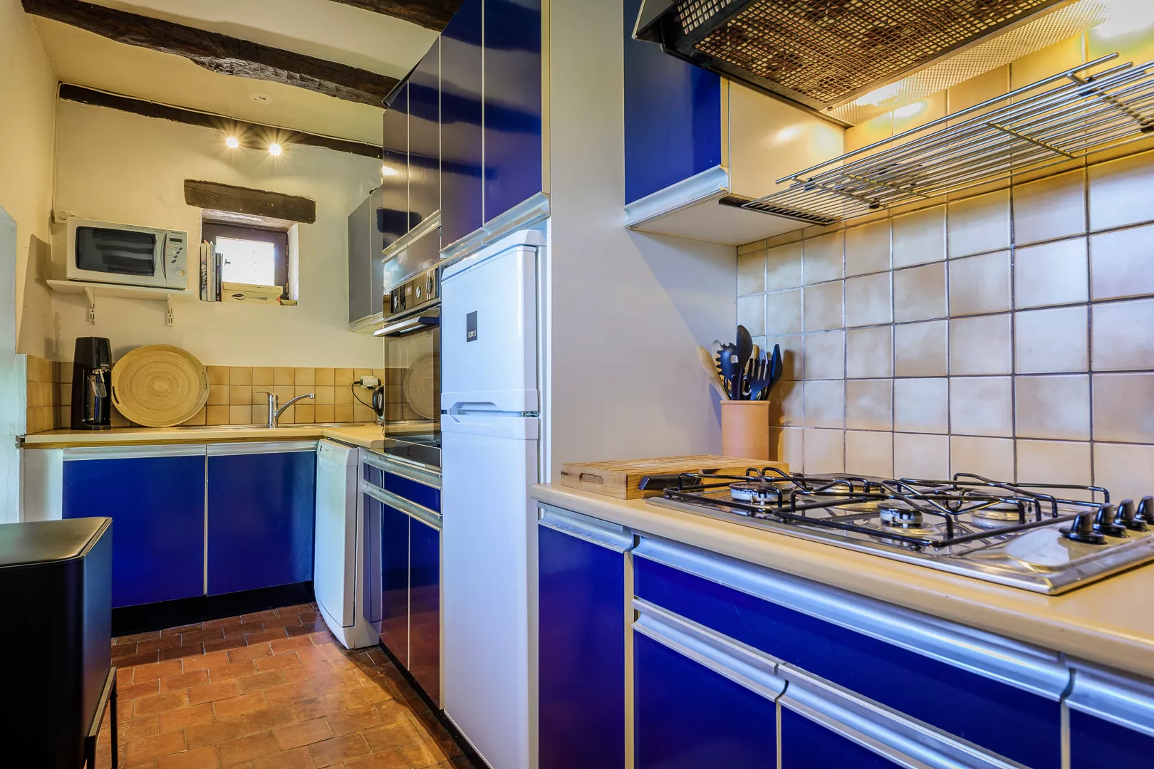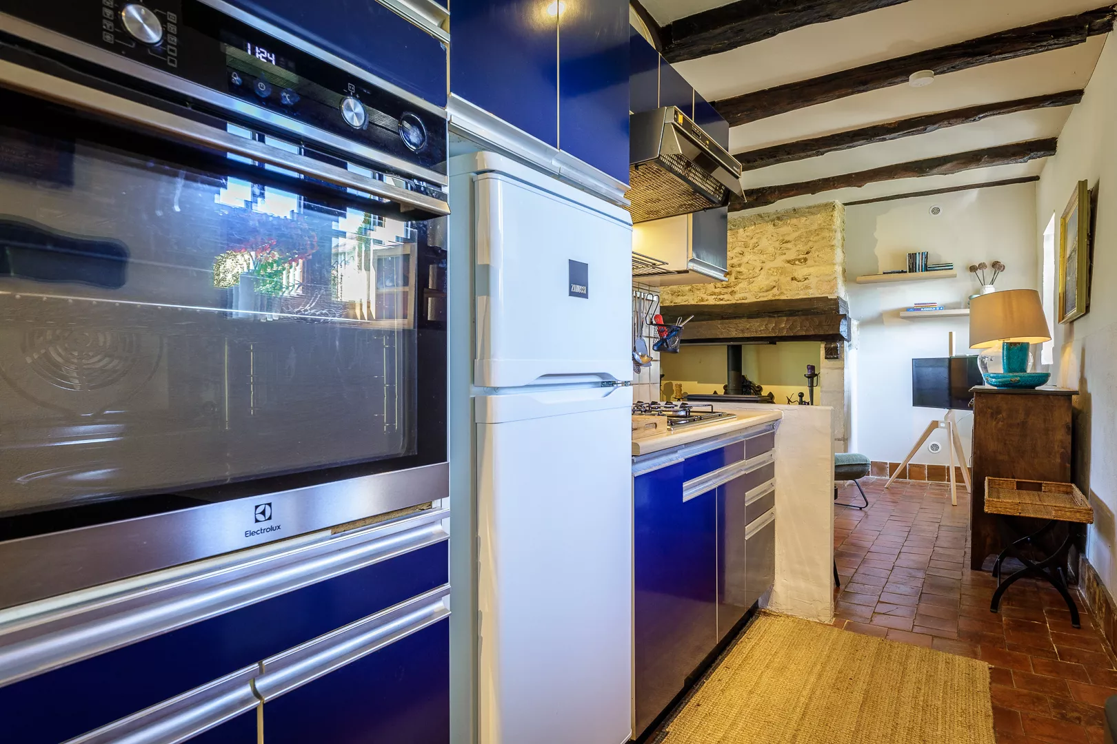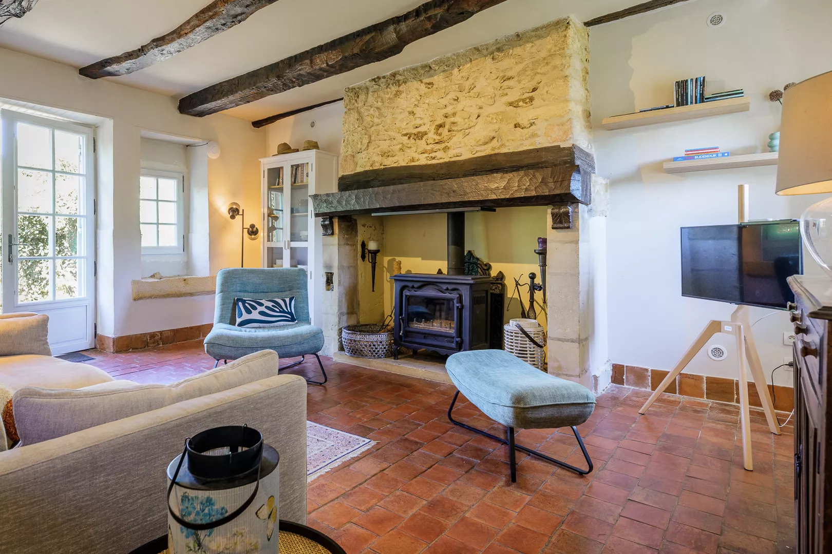 Geniet samen van de warm ingerichte woonkamer met kachel (natuurlijk niet vaak nodig) of maak een lekker Frans gerecht in de keuken met fijne eettafel… Vanuit de keuken loopt u zo het terras op met uw lekkere eten om op een van de terrassen samen te lunchen!