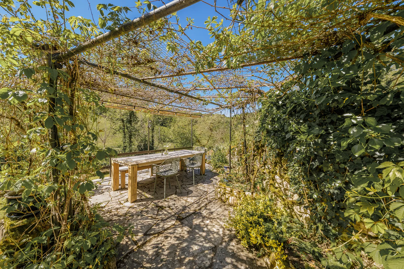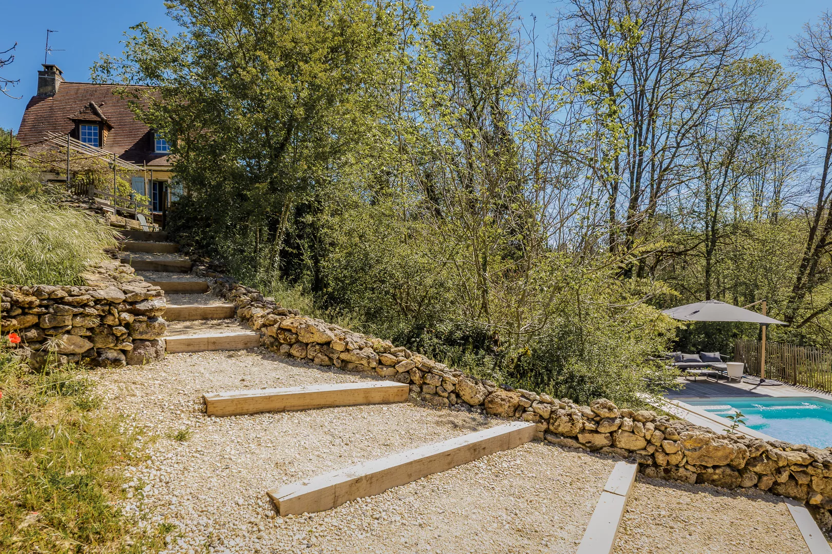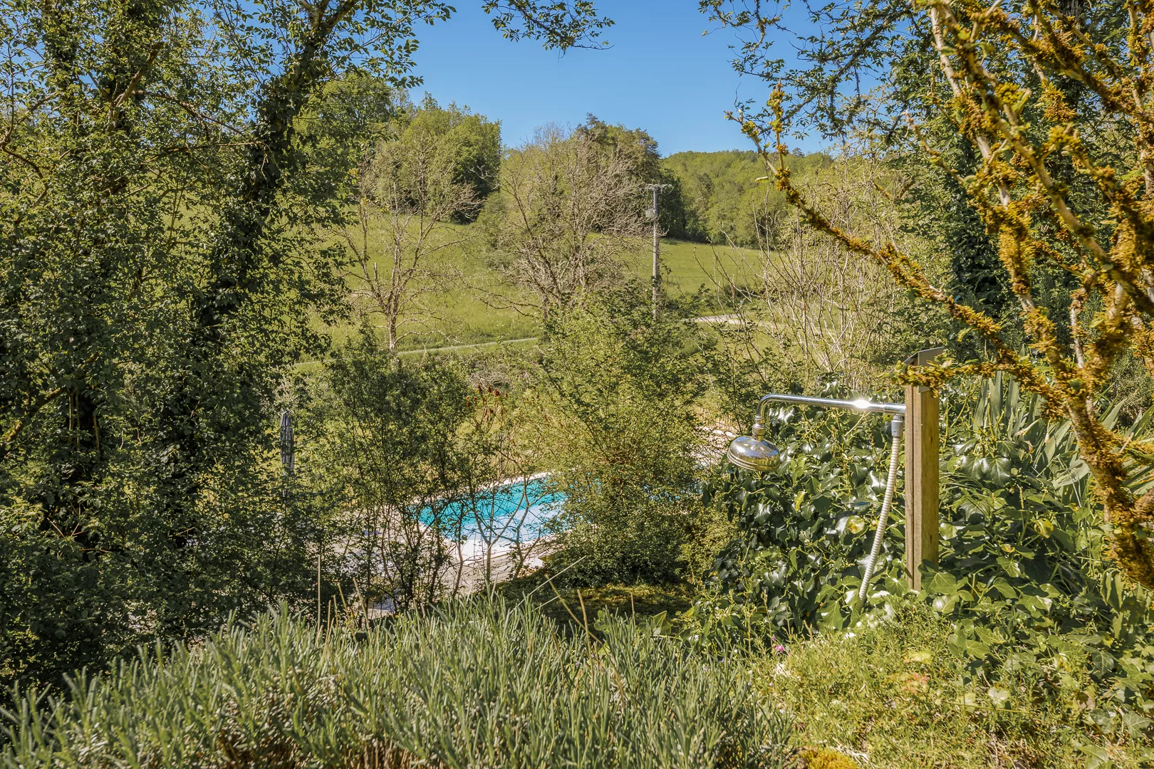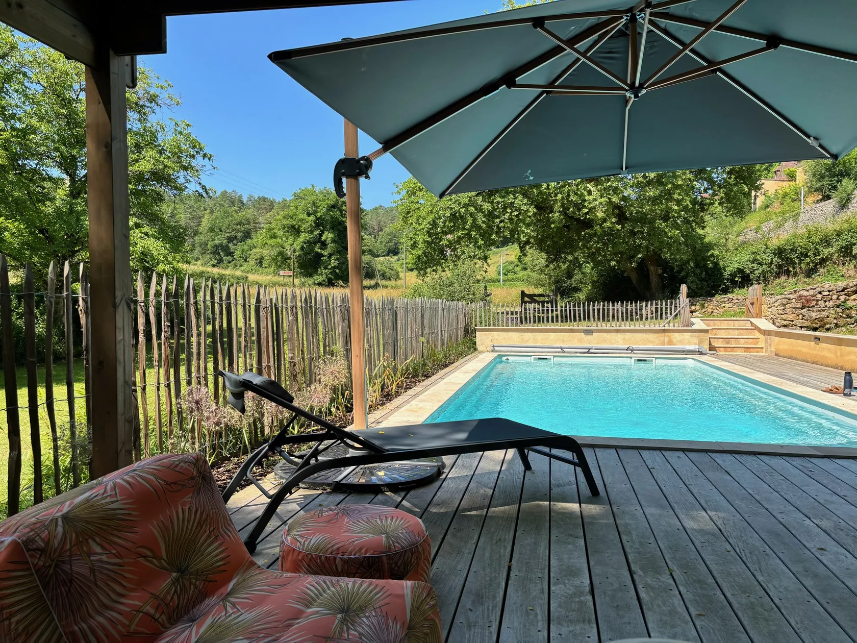 De tuin strekt zich uit over 3 niveaus; 1e niveau met eettafel en uitzicht over de heuvels, 2e terras tuin met pingpong tafel en buitendouche en op het onderste niveau bevindt zich een heerlijk verwarmd privé-zwembad van maar liefst 9x4 meter en 150 cm diep en daaraan een geplaatste poolhouse (2024). De tuin is voorzien van een moderne lounge set waar men kan ontspannen en tevens kan genieten van een zwempartij.