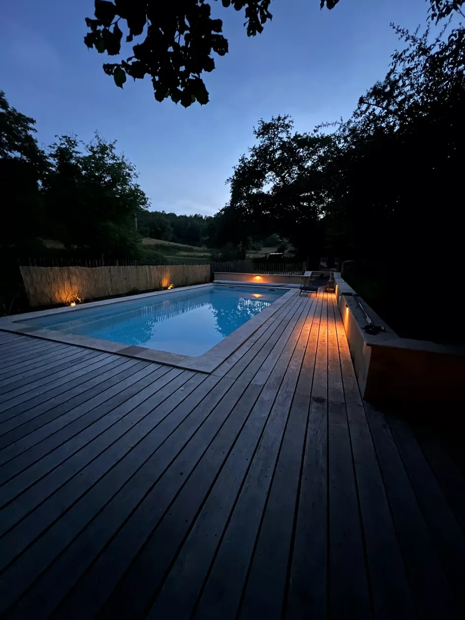Op het eerste niveau staat een eettafel met prachtig uitzicht over de heuvels. Het tweede niveau beschikt over een terras met pingpongtafel en buitendouche. Op het onderste niveau vindt u het verwarmde privézwembad van 9 bij 4 meter en 150 centimeter diep, voorzien van een afdekking volgens de Franse veiligheidsnormen. Rond het zwembad staat een moderne loungeset onder een overkapping en ligbedden waar u heerlijk kunt ontspannen en genieten van een verfrissende duik.