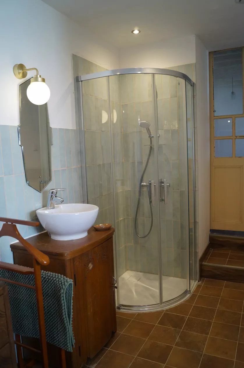 - Een slaapkamer met een tweepersoonsbed (140 cm). De badkamer staat in open verbinding met de slaapkamer.