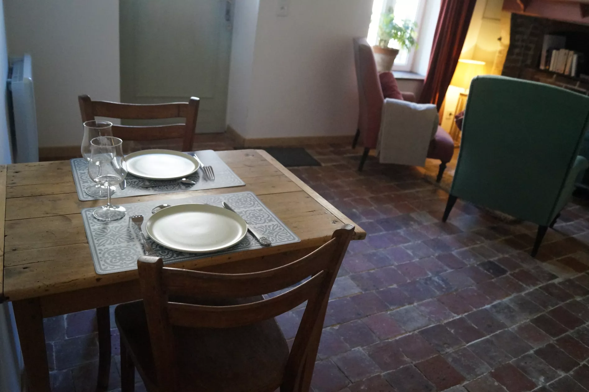 - Een woonkamer met originele terracotta vloertegels en een oude broodoven (niet in gebruik).