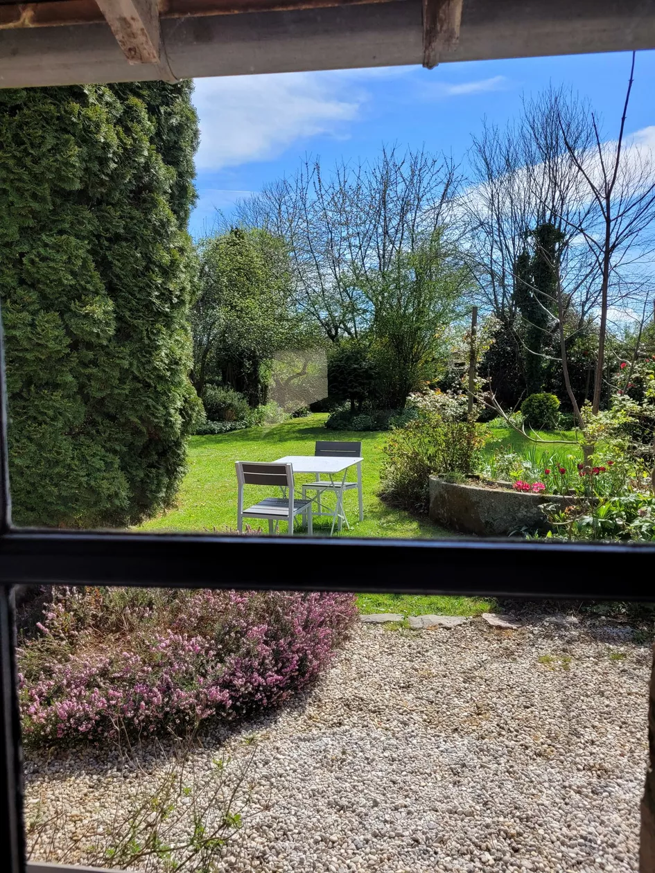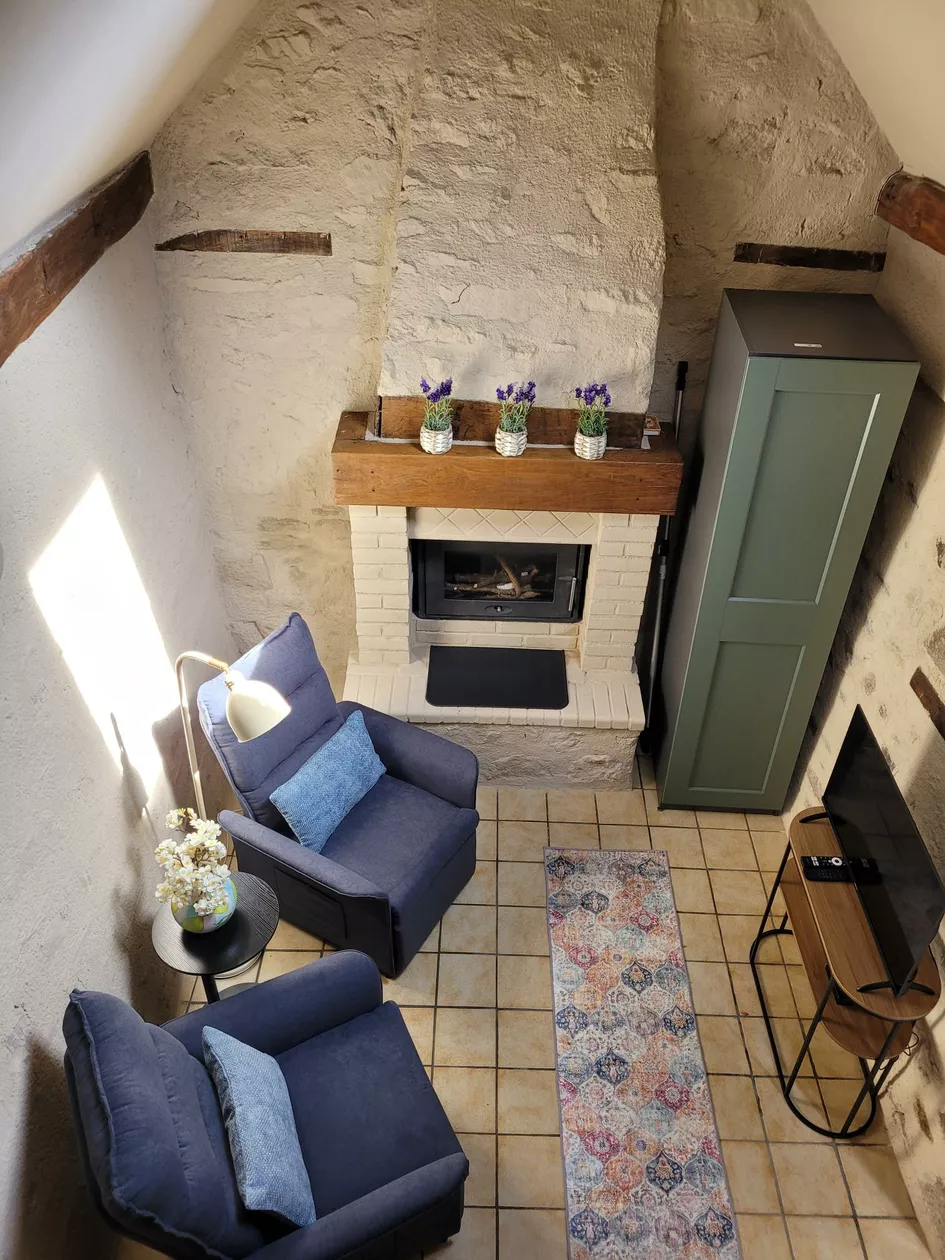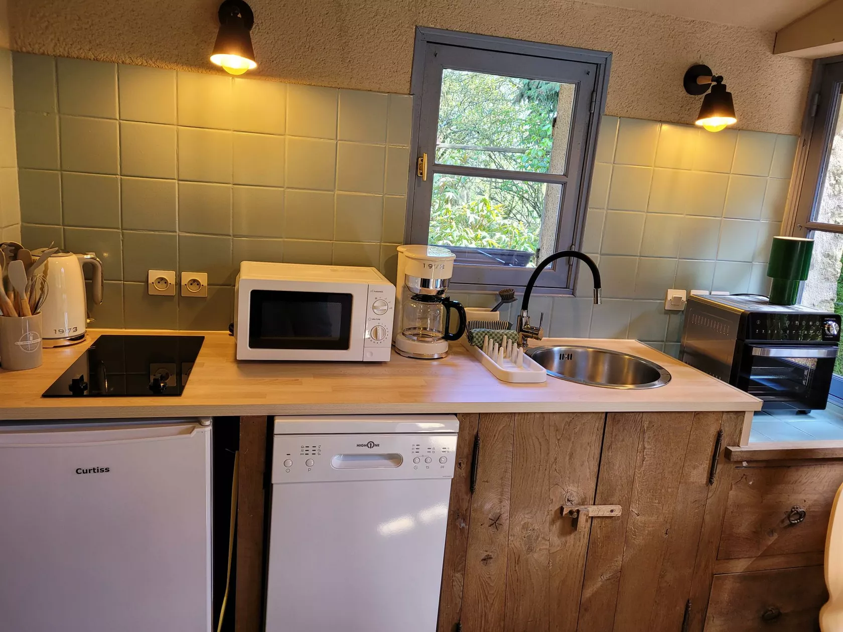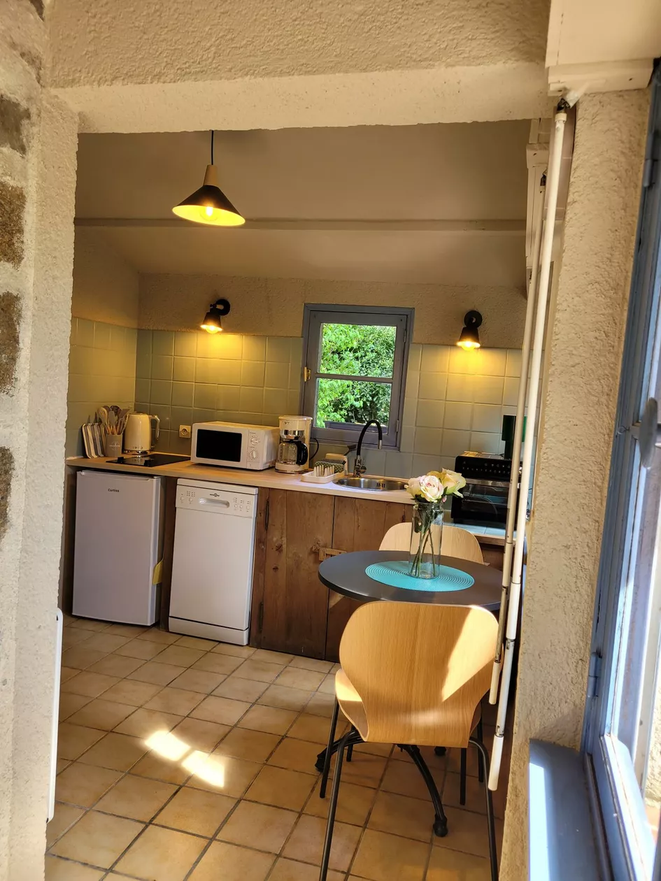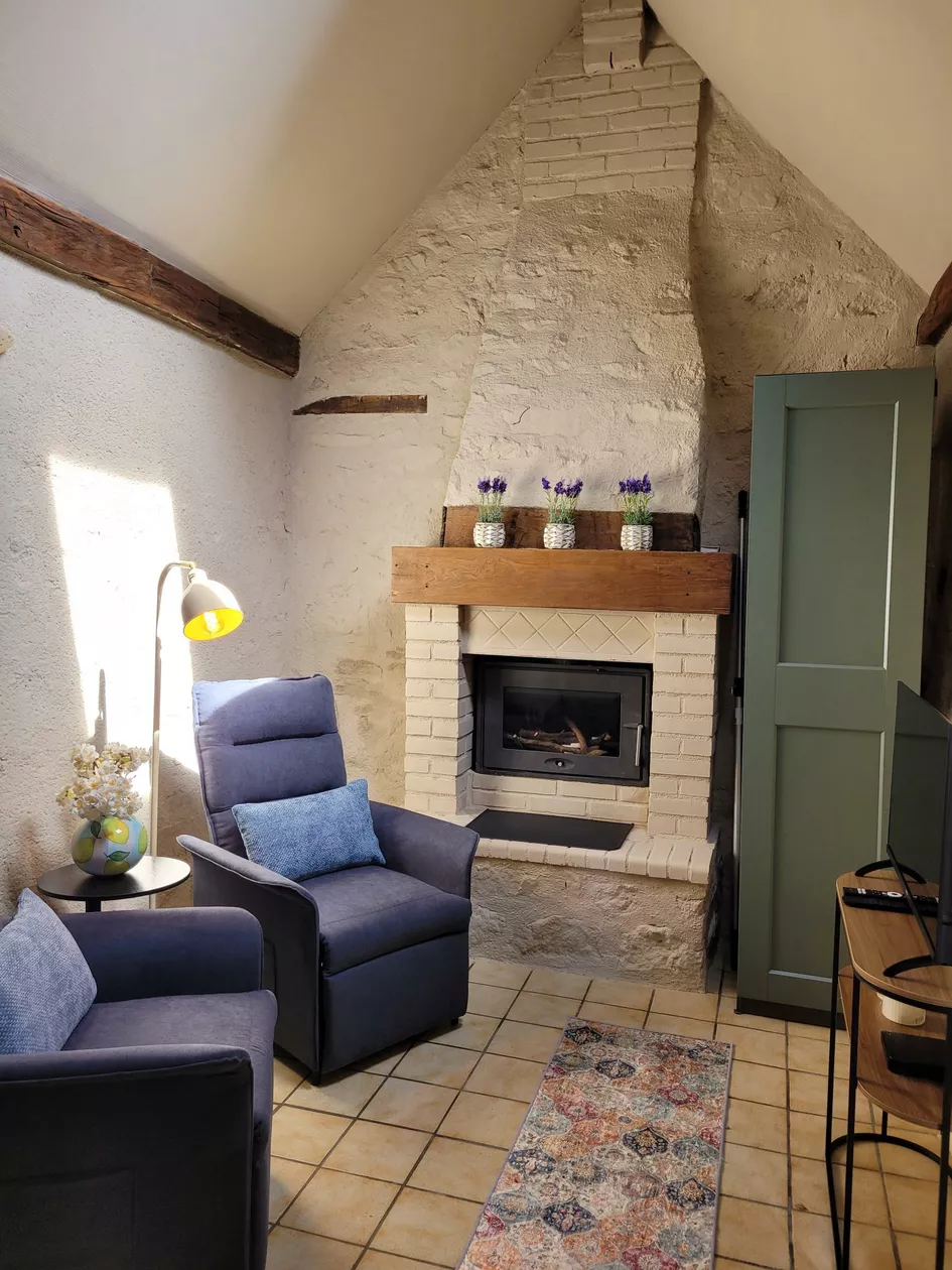 De gîte heeft een open keuken, uitgerust met een vaatwasser, wasmachine, kookfornuis, oven combi airfryer , magnetron, koel/vries combinatie, koffie apparaat en met een eettafel met drie stoelen met zicht op de tuin. In de woonkamer met haard staan comfortale relaxstoelen.