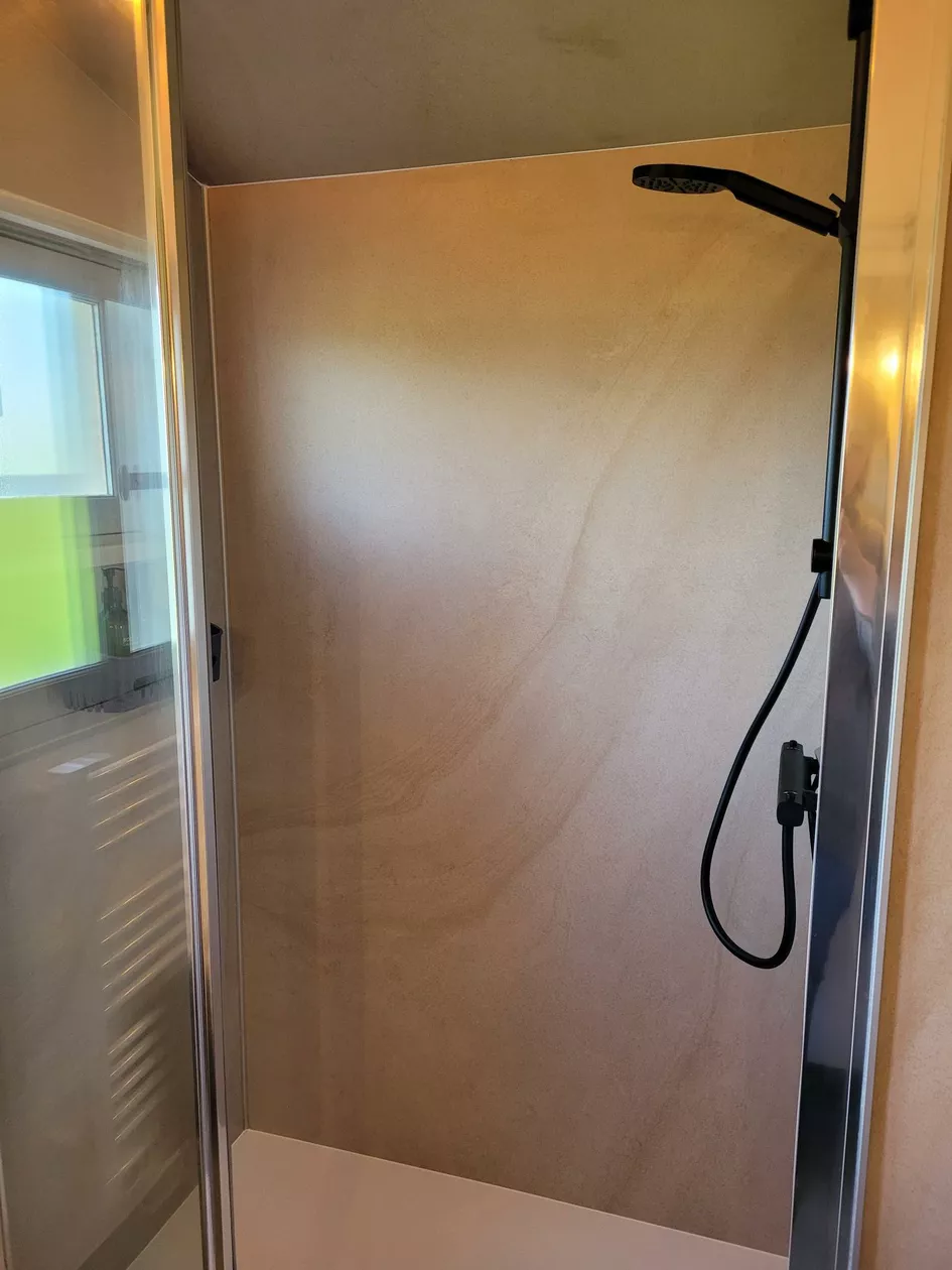De badkamer met inloopdouche, wastafel en toilet op 't gelijkvloers .