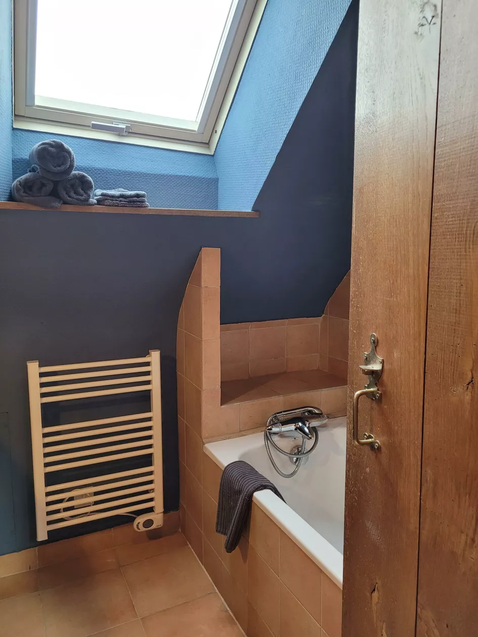De badkamer heeft een ligbad met douche mogelijkheden , lavabo en appart wc.