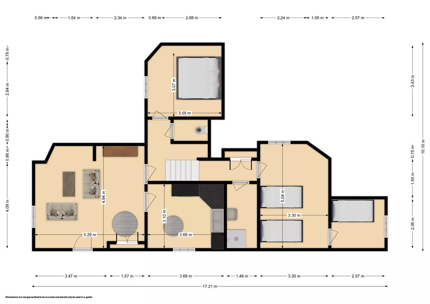 Het biedt comfortabel plaats aan maximaal vijf gasten in drie slaapkamers: twee flexibele kamers (met een tweepersoonsbed of twee aparte bedden) en een eenpersoonskamer.