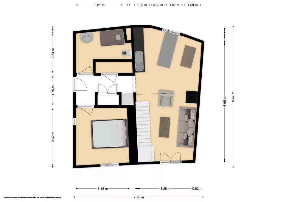 Een open keuken, eet- en woonkamer met een houtkachel met daarboven een mezzanine voor twee personen. Op de begane grond is een tweepersoonsslaapkamer met een aparte familiebadkamer en toilet.