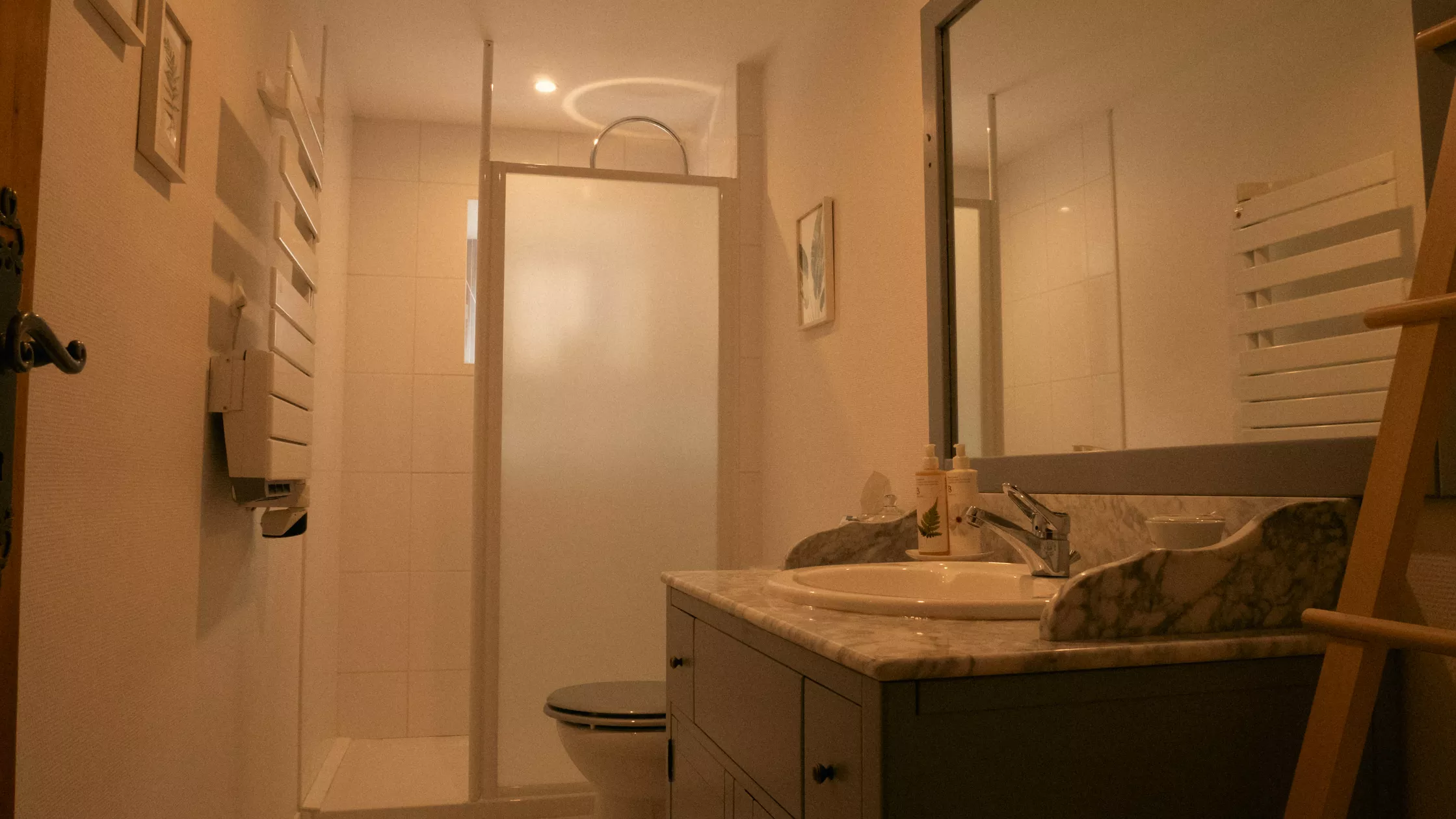 Op de begane grond vind je ook een badkamer met een inloopdouche, wastafel en toilet.