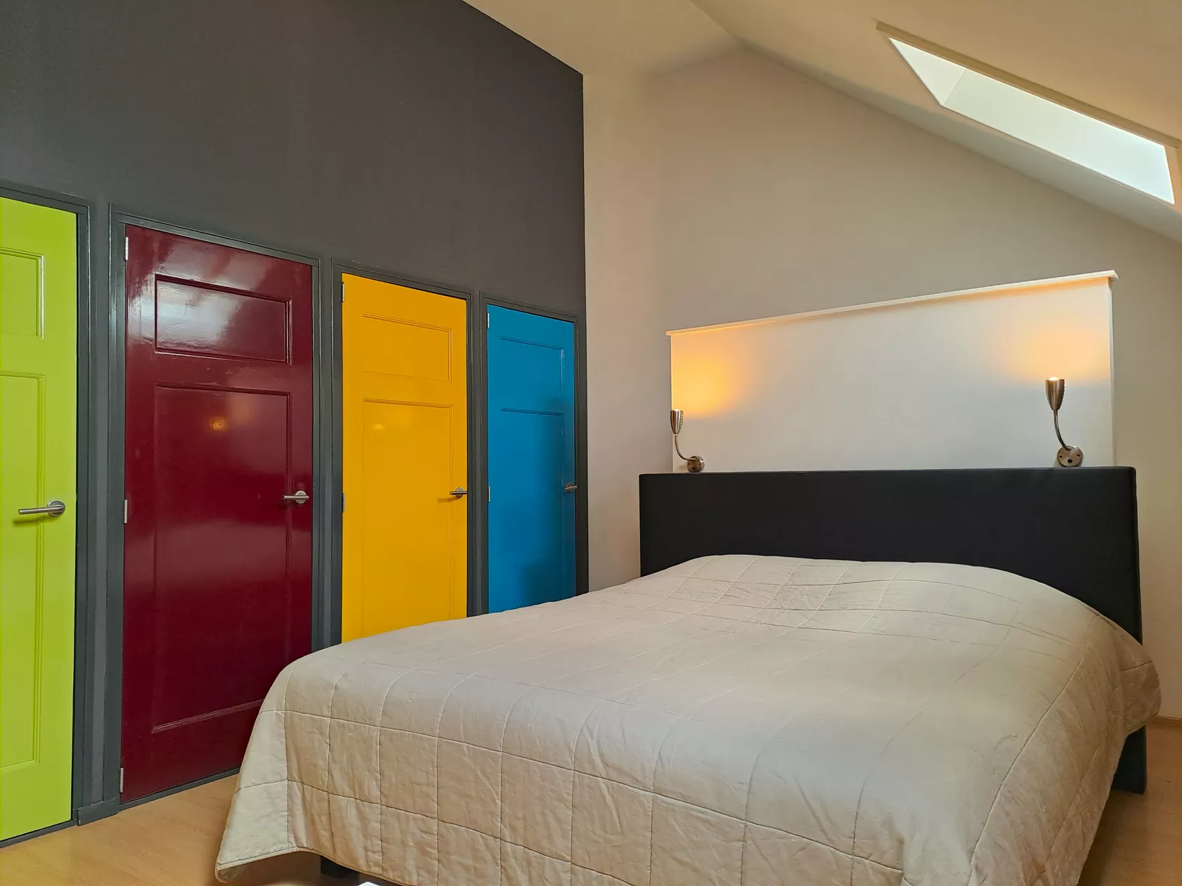 Hier is een slaapkamer met een twee persoons bed ( matrasmaat 1.80 x 2.00 met één tweepersoonsdekbed van 2.20 x 2.40 cm ) 2 bedlampjes , een bijzonder gekleurde kastenwand , een wastafel en een stoeltje.