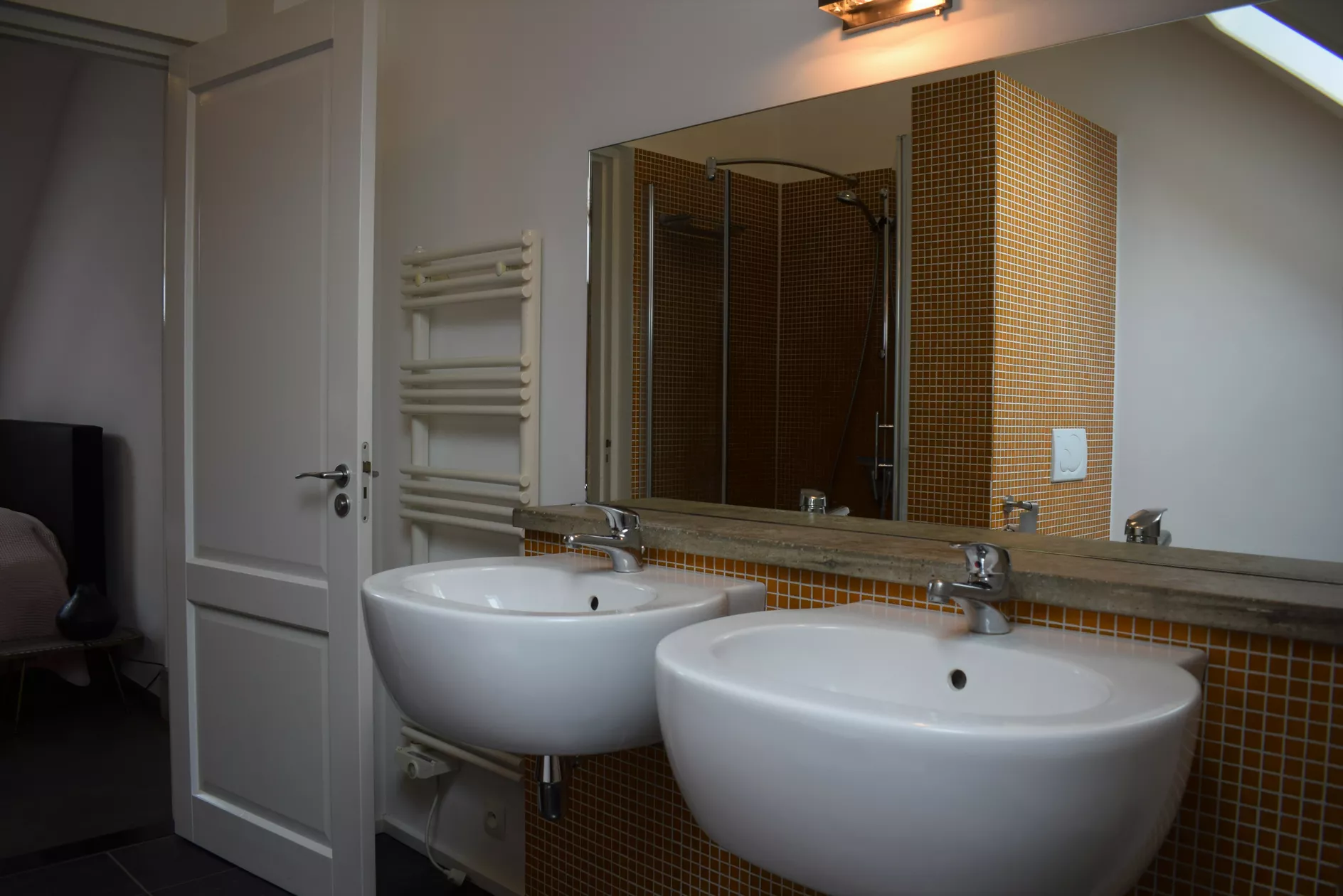 • Grenzend aan deze slaapkamer is een badkamer met douchecabine, dubbele wastafel en toilet.