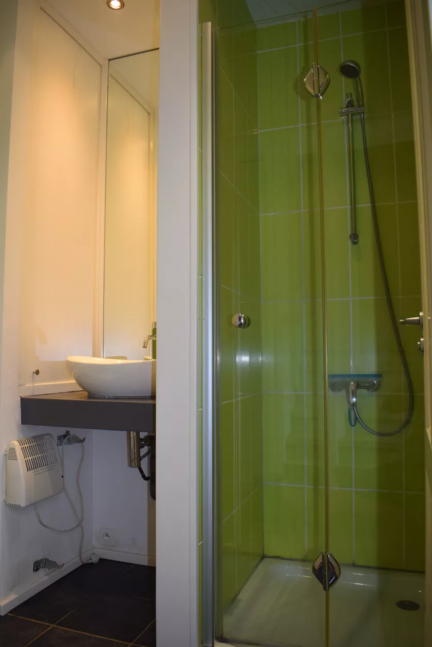 • Vanuit de woonkamer komt u in een gangetje waar zich een wasmachine en poetsspullen bevinden. Hier is ook een 2e badkamer ; douchecabine, wastafel en een toilet. U kunt deze ruimte elektrisch verwarmen.