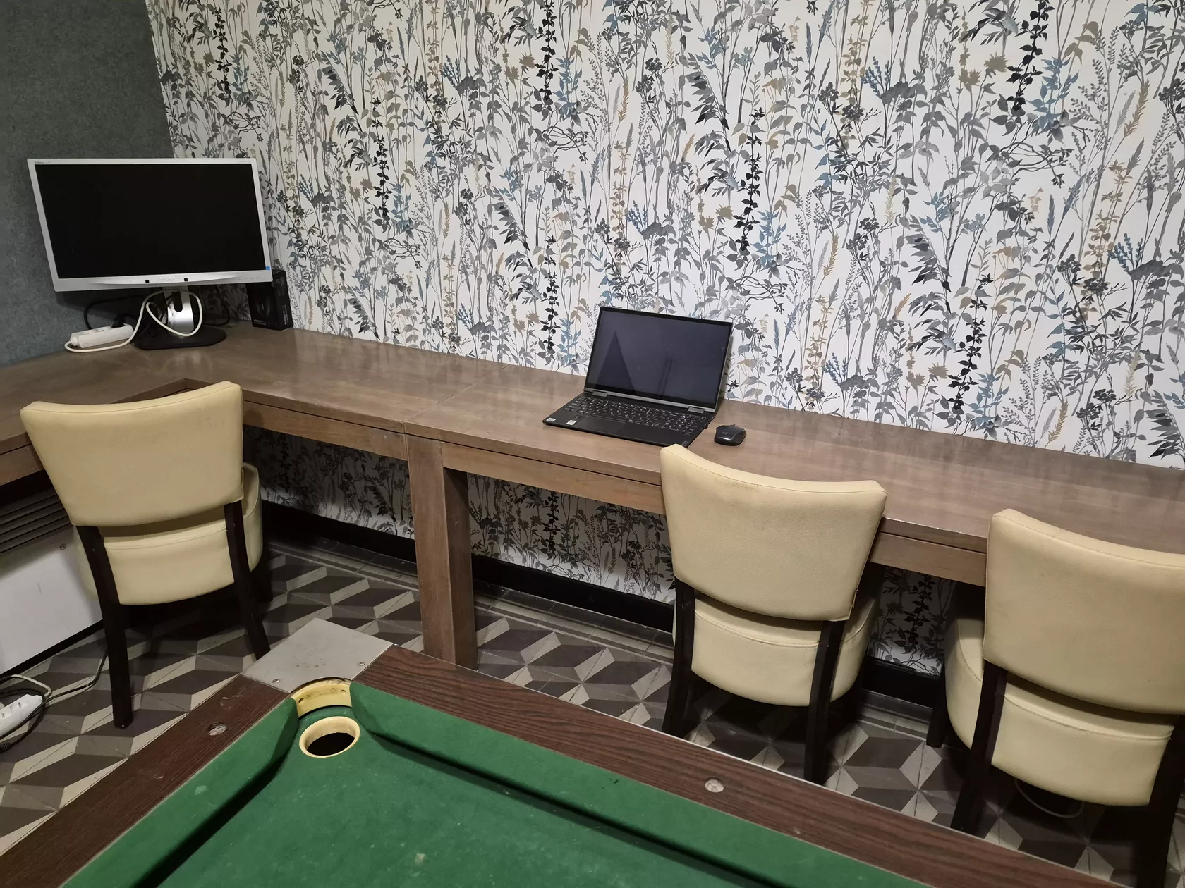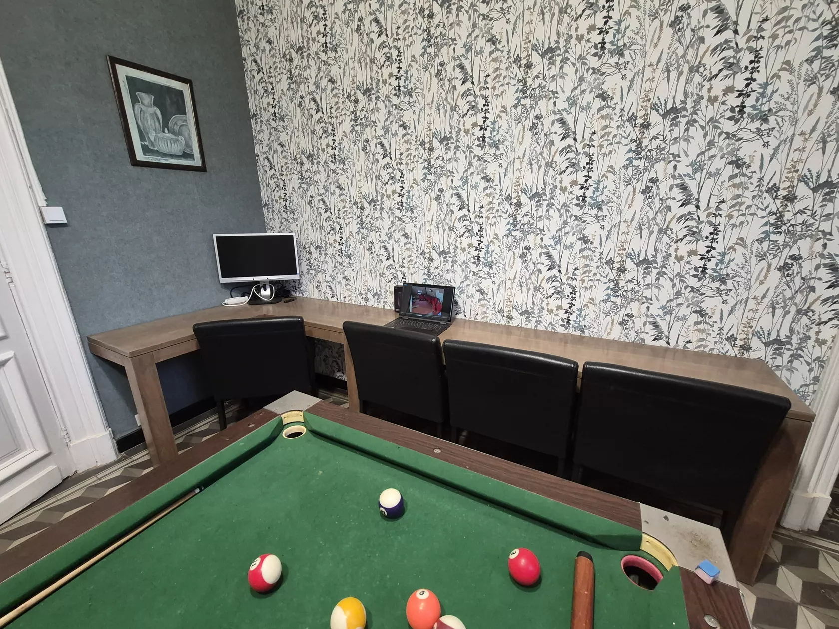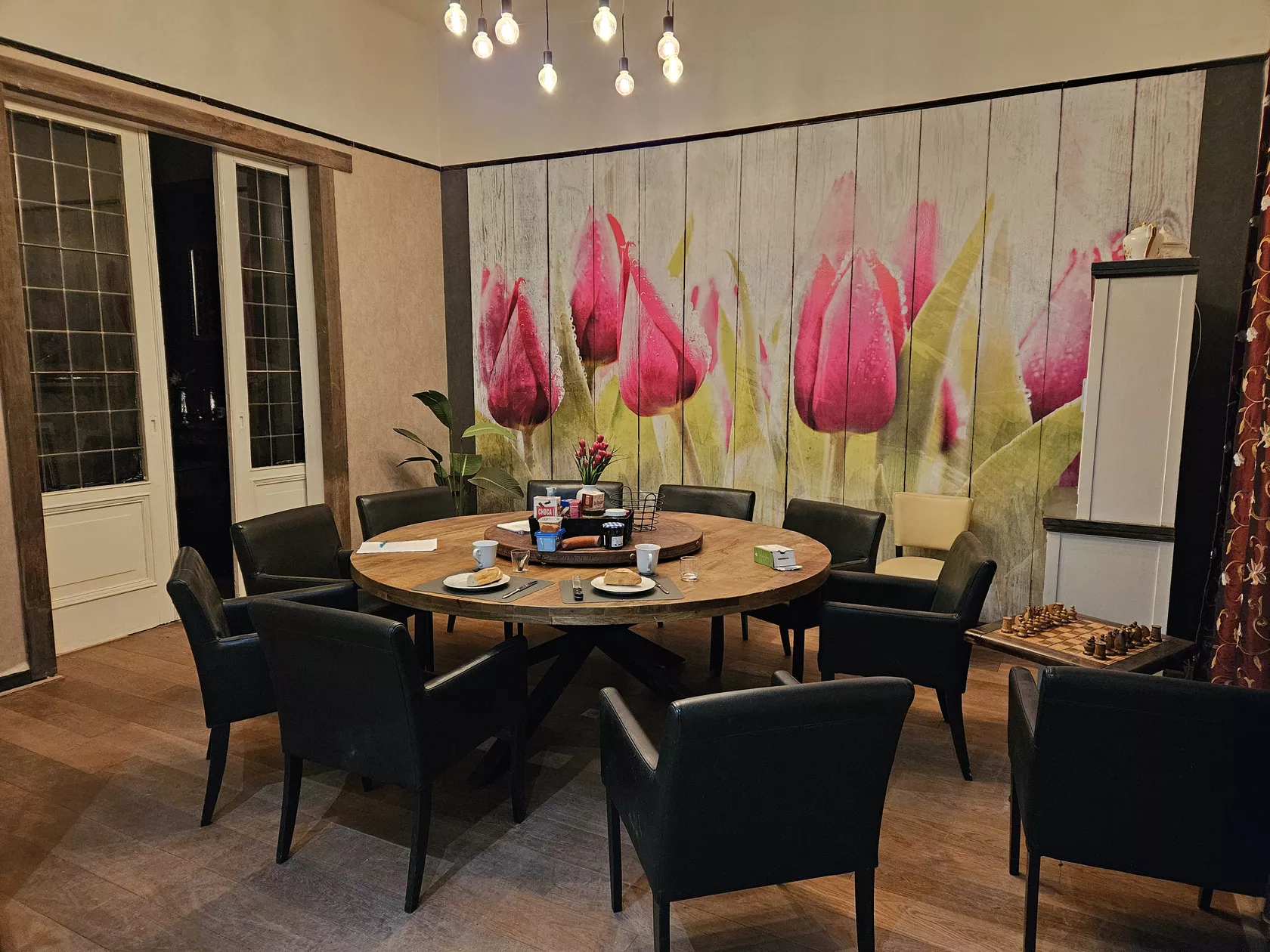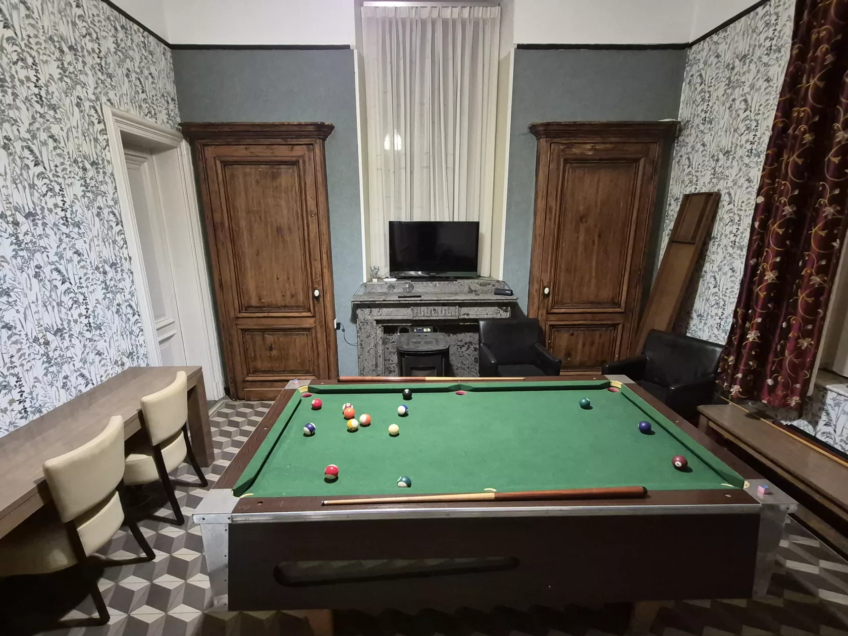 Het bevat een woonkamer met TV en houtkachel, een zeer goed ingerichte keuken, een ruime eetkamer met grote ronde eet- /vergadertafel en een speel- /tv-kamer met o.a. een groot poolbiljart, een sjoelbak en vele bordspellen..