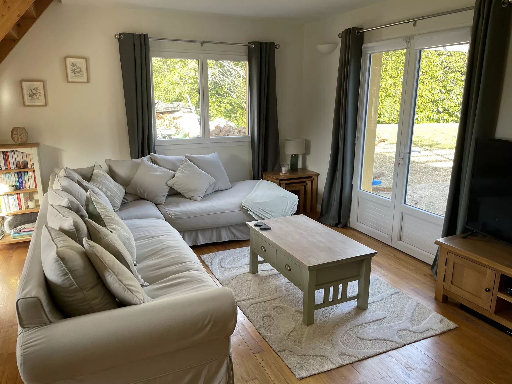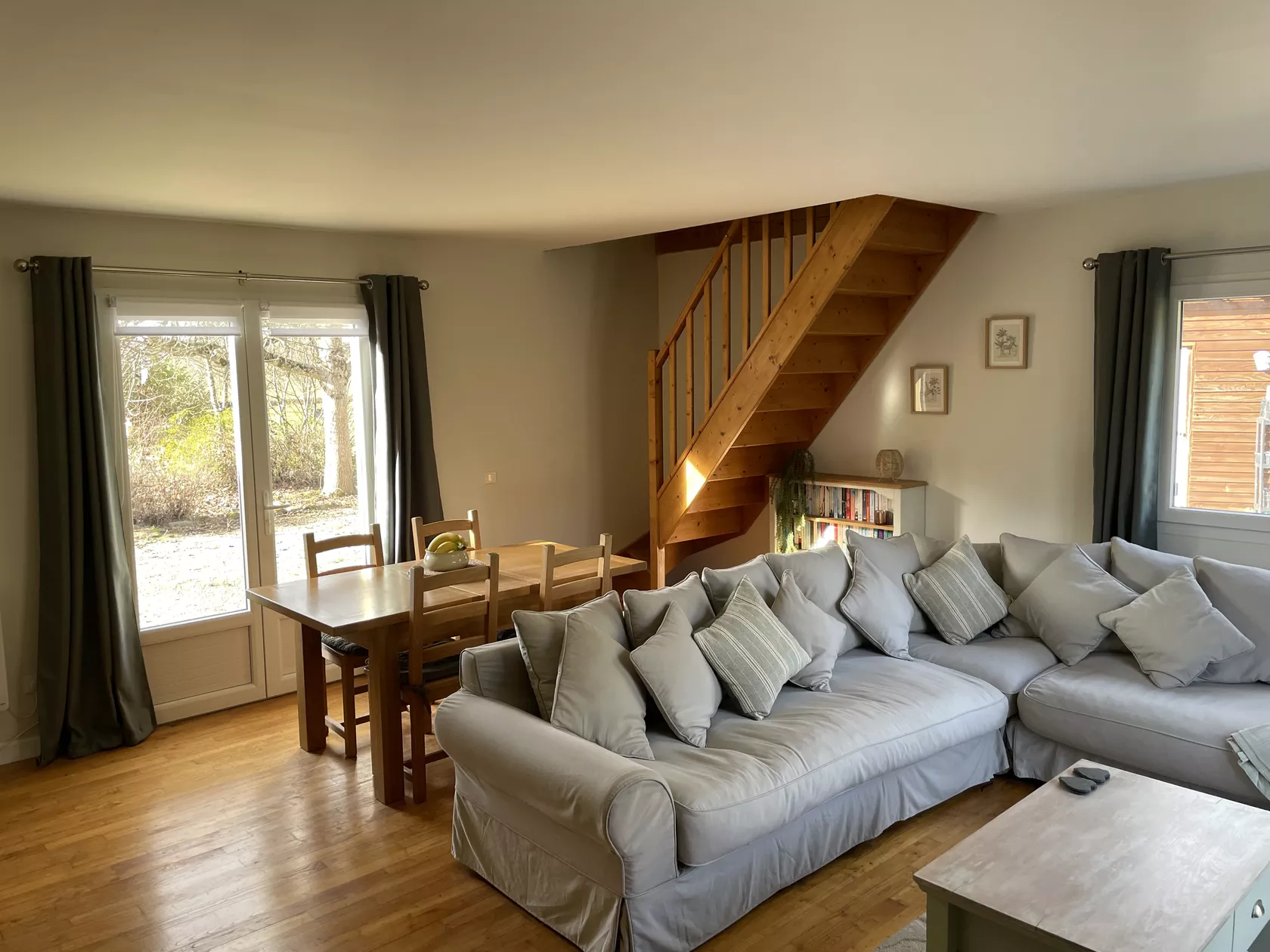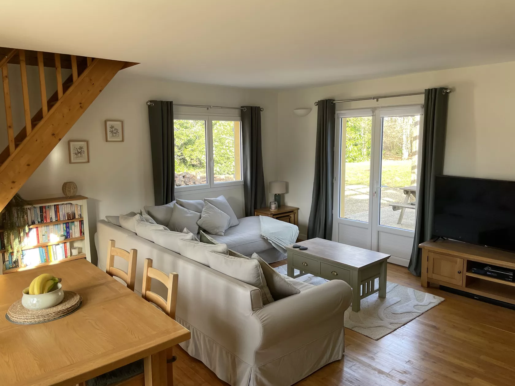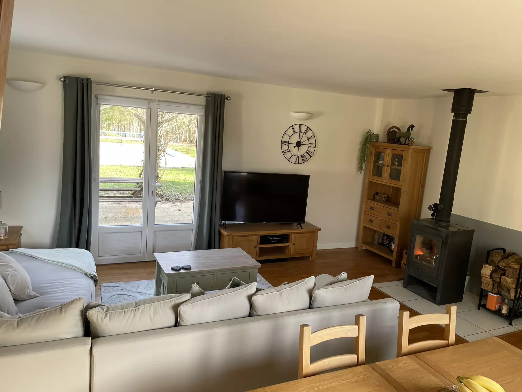 Vanuit de keuken kom je in een lounge/eetkamer met een L-vormige bank, eettafel, grote smart tv en een multimediapakket van Free met glasvezelinternet, talloze zenders/films/on-demand programma's en een dvd-speler.