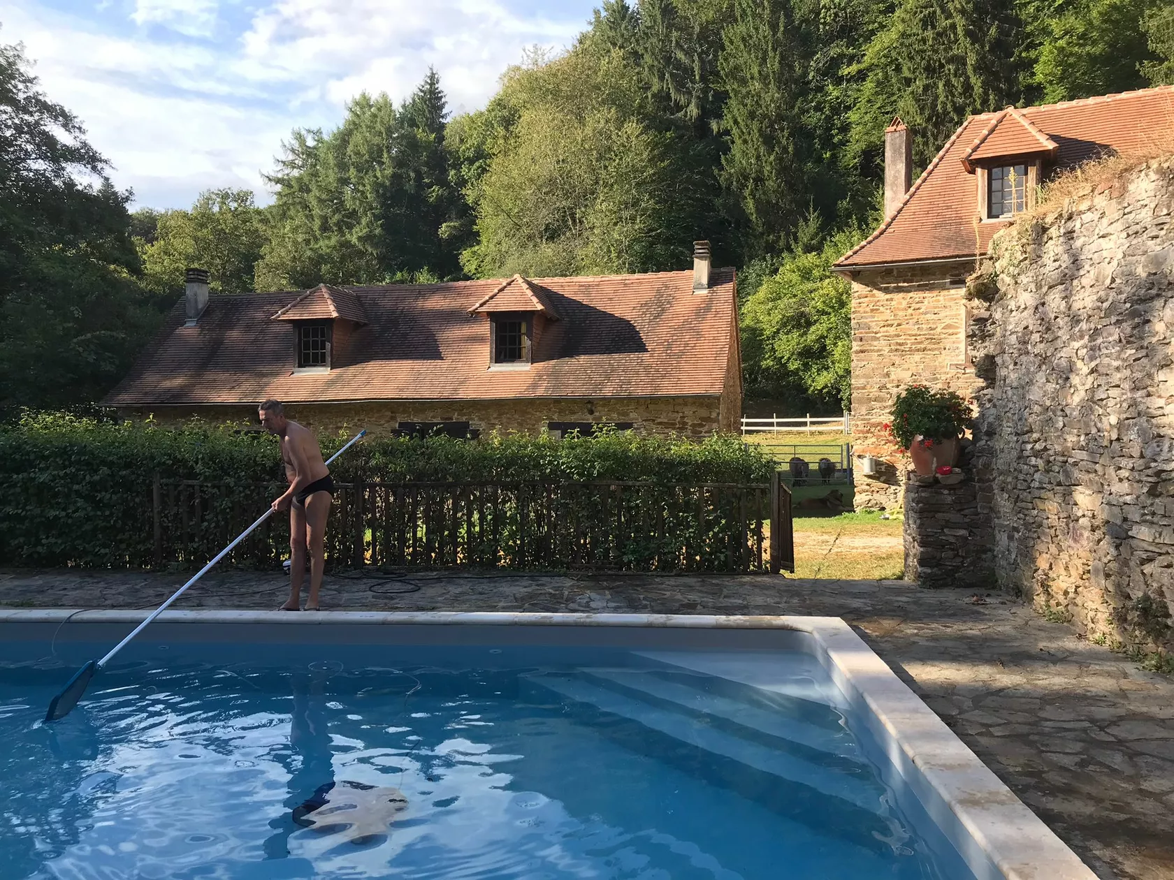 Voor het huis ligt een zoutwater zwembad en achter het huis bevindt zich een weiland met paarden.