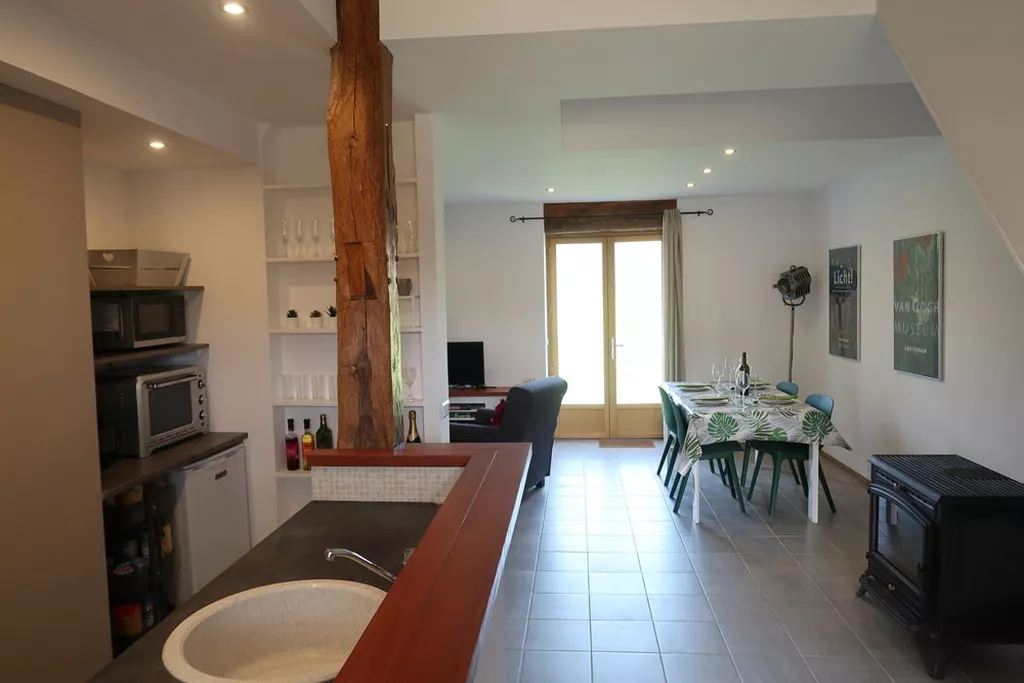 Een open keukenruimte met een volledig uitgeruste keuken met vaatwasser, een eethoek en een woongedeelte met een houtkachel. Er is een heerlijk terras aan de achterkant van de gite met zitje en bbq, met uitzicht op het veld. Op de tweede verdieping zijn er drie slaapkamers - twee met twee eenpersoonsbedden en een eenpersoonsbed voor vijf gasten, samen met een badkamer en douche.