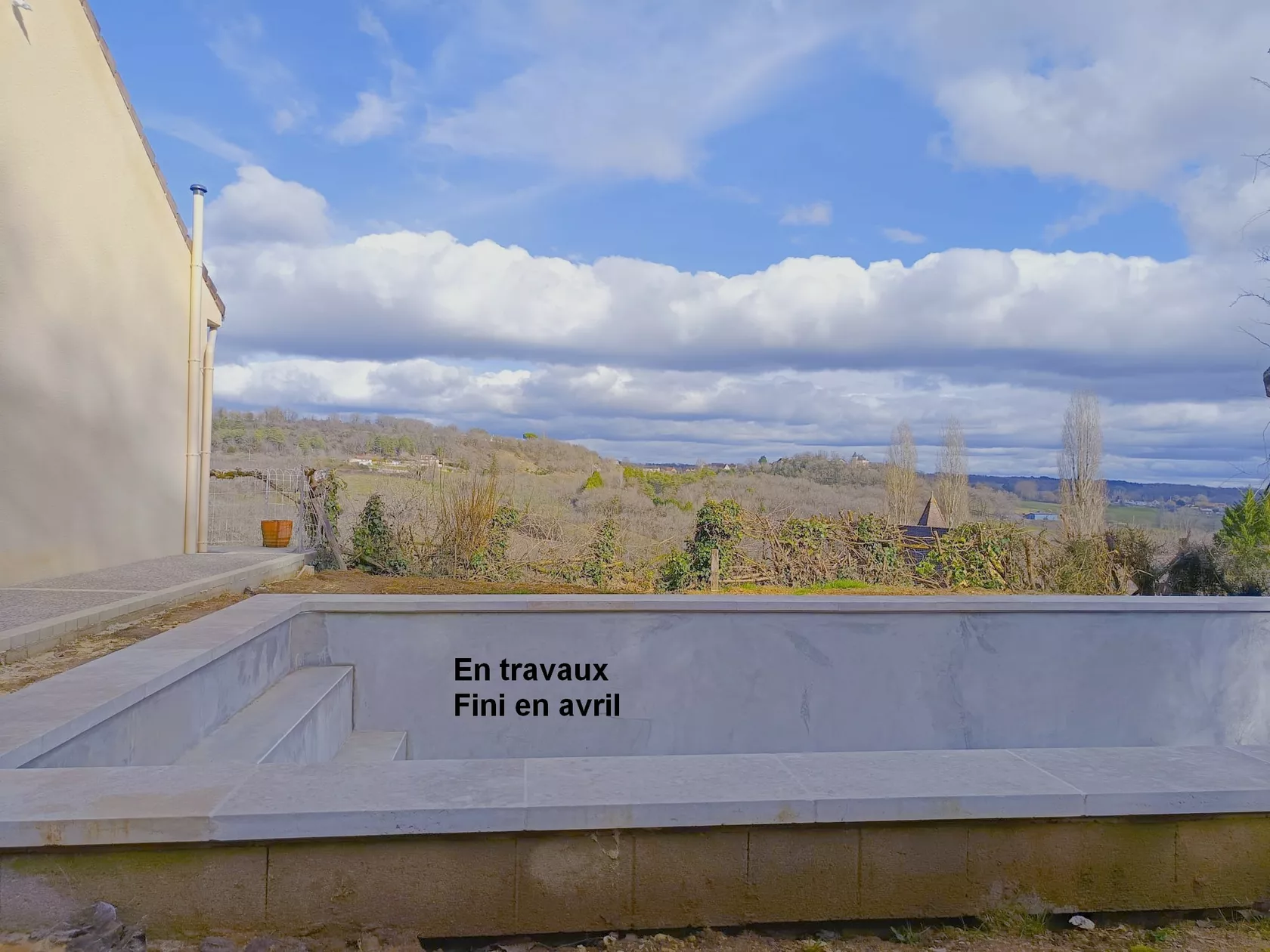 Het terras en het zwembad bieden uitzicht op de heuvels van de Dordogne.