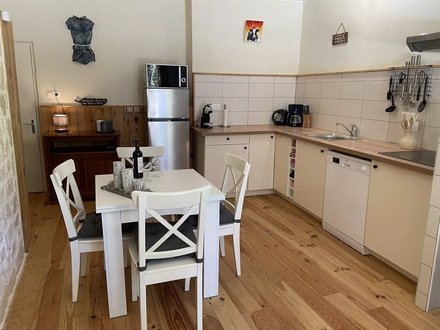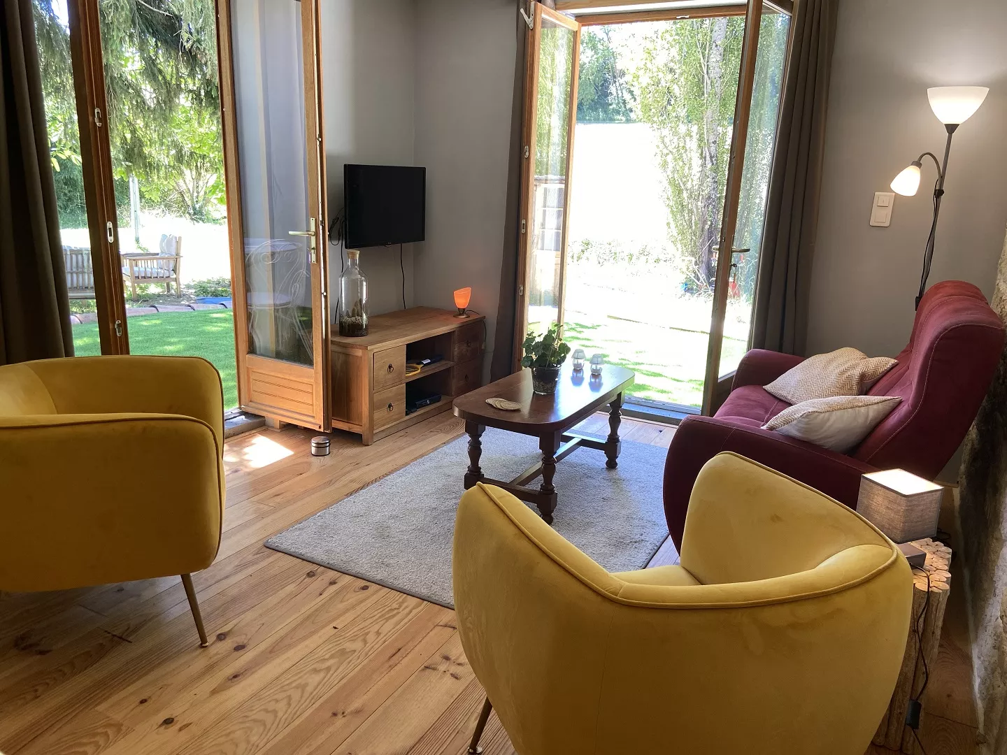 Het huis heeft een sfeervolle woonkamer met open keuken. De woonkamer heeft aan 2 zijden openslaande deuren naar het terras. Er is goede Wifi ontvangst en een TV met chromecast.