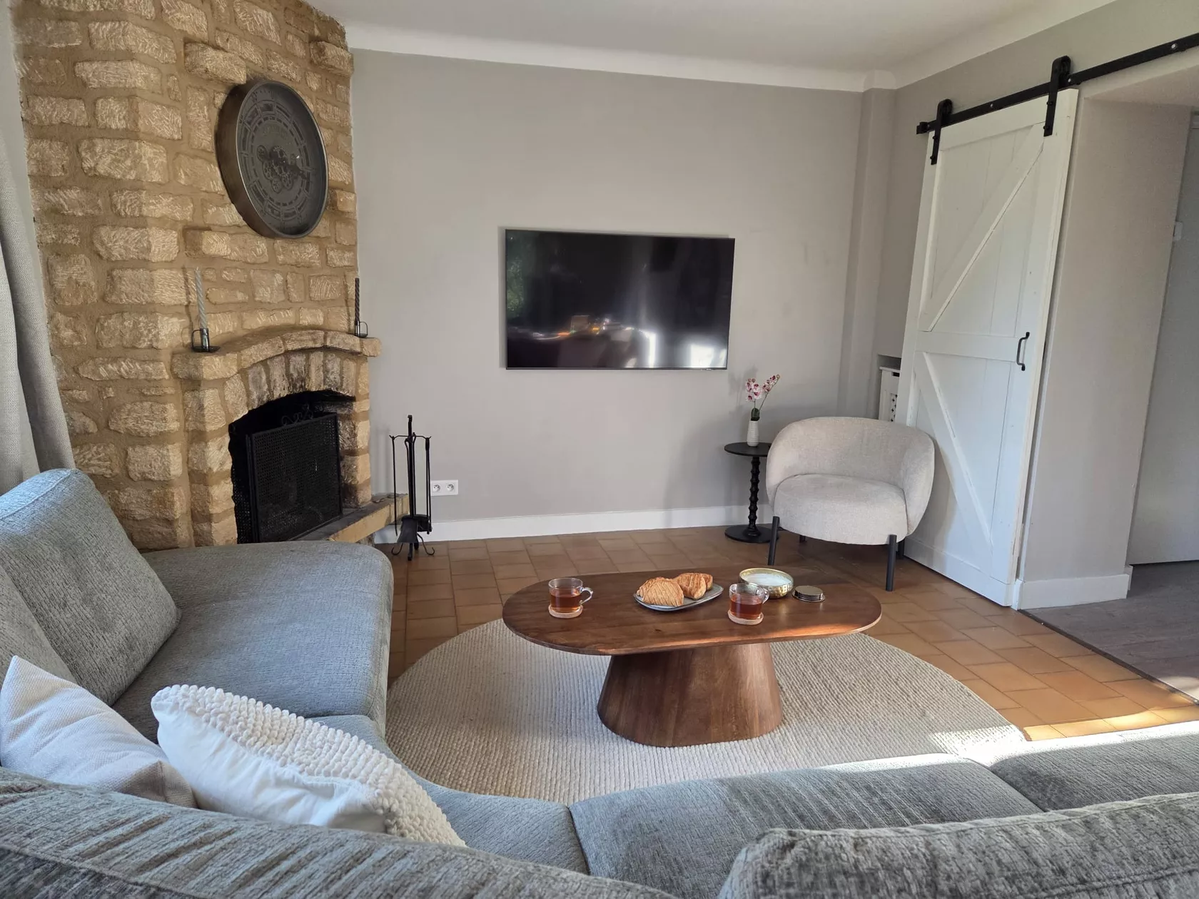 Binnen vind je een sfeervolle woonkamer met open haard, een fijne plek voor de wat koelere avonden.