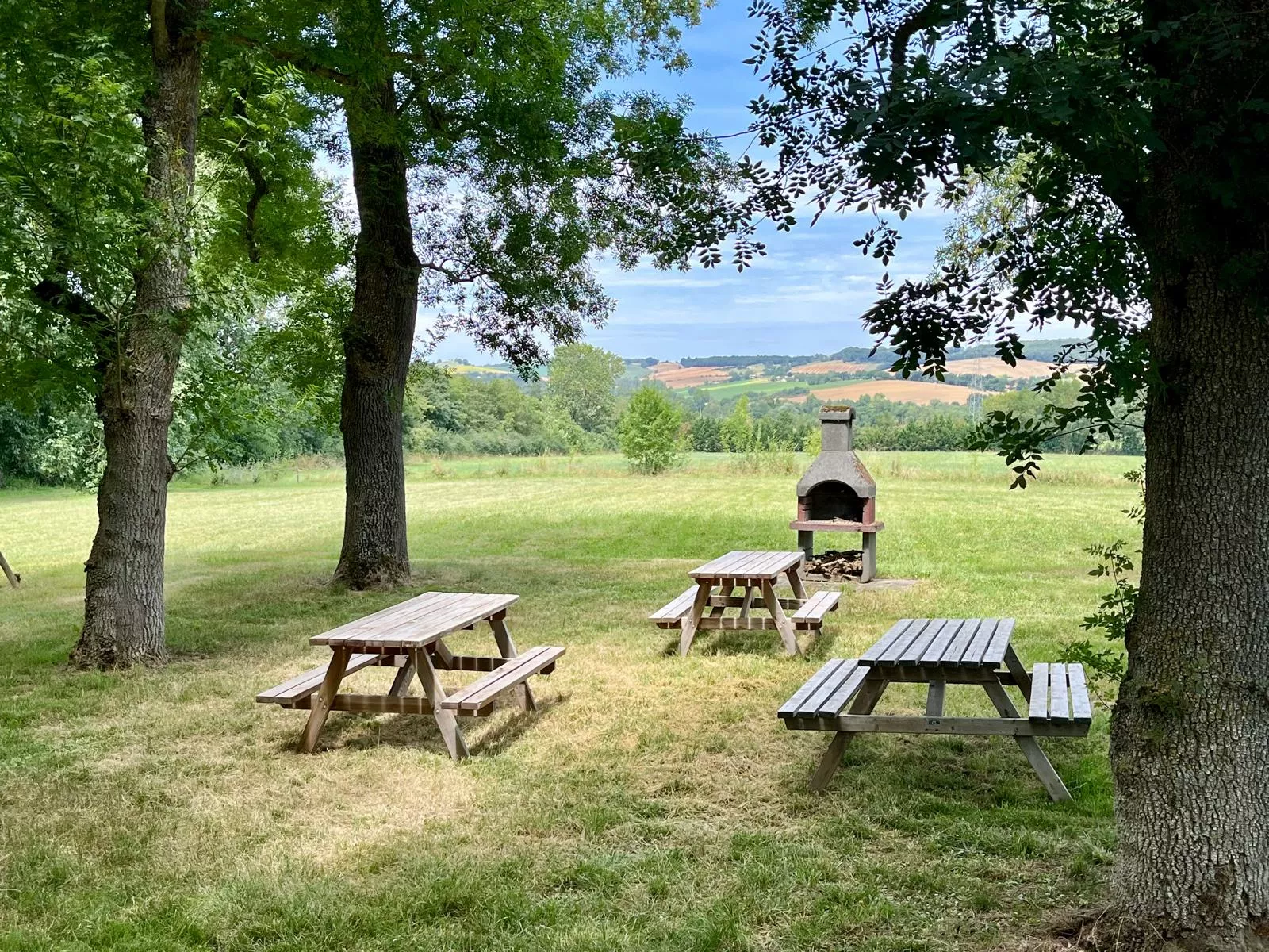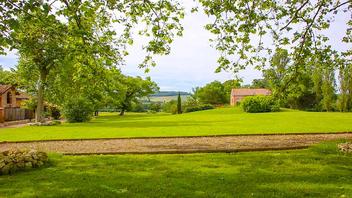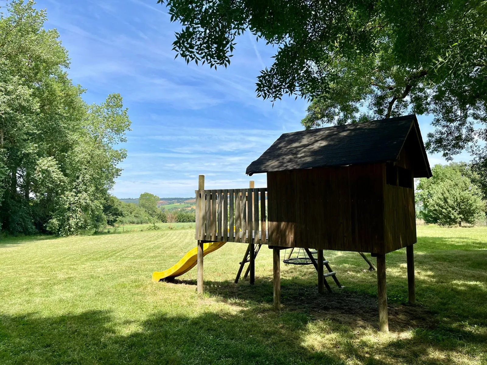een speeltuin met glijbaan, schommel, picknicktafels, jeu de boulesbaan en natuurlijk het verwarmde zwembad..