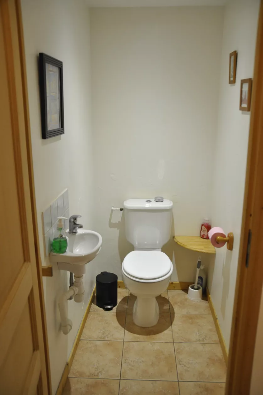 Sanitair: Een doucheruimte met wastafel, verwarmd handdoekenrek en een wasmachine. Er is een apart toilet met wastafel.
