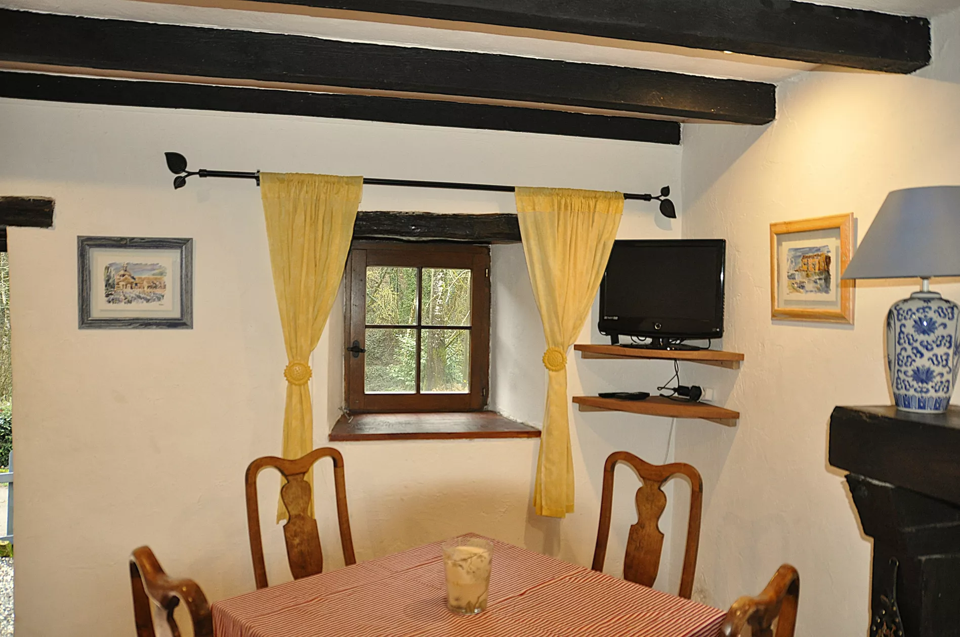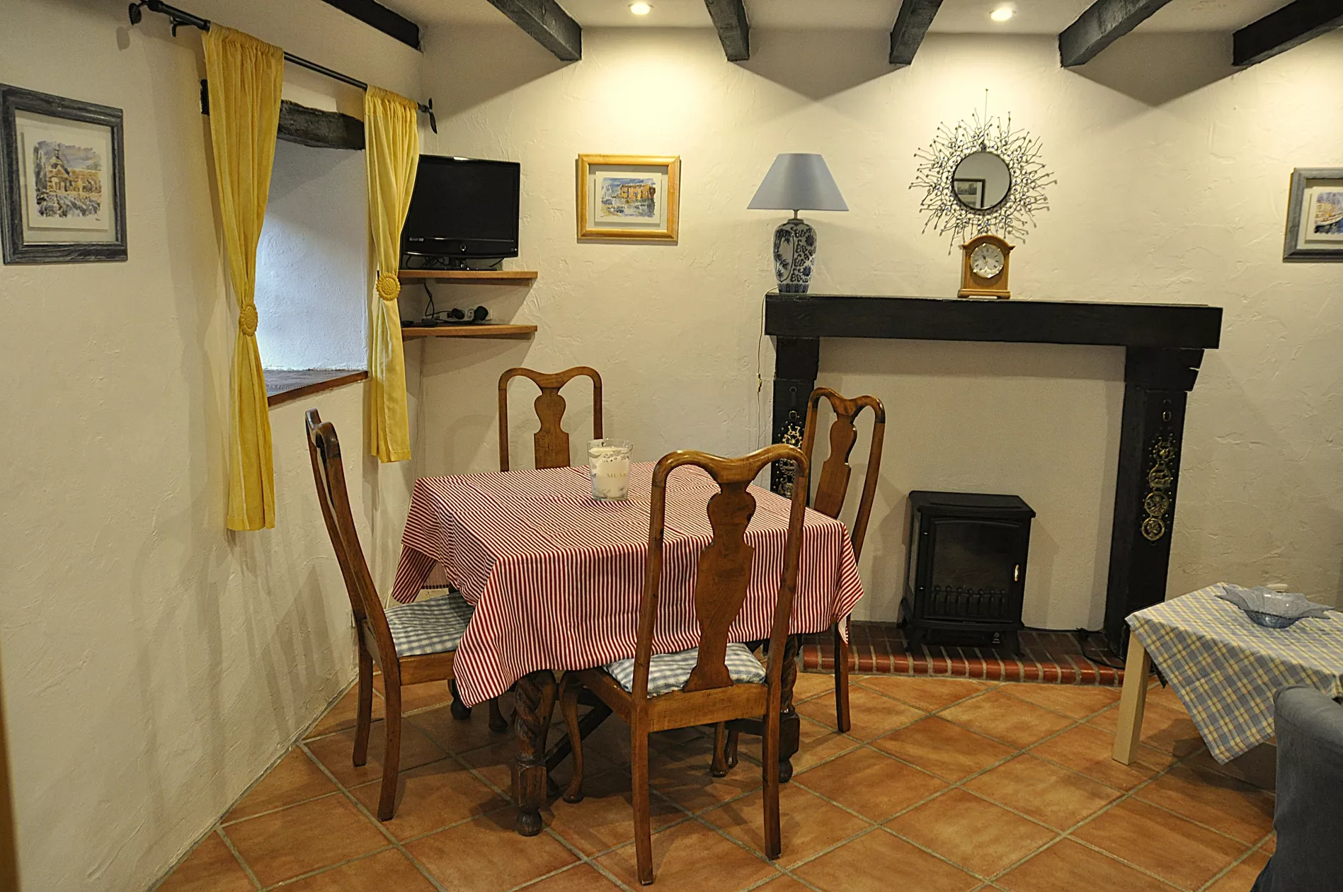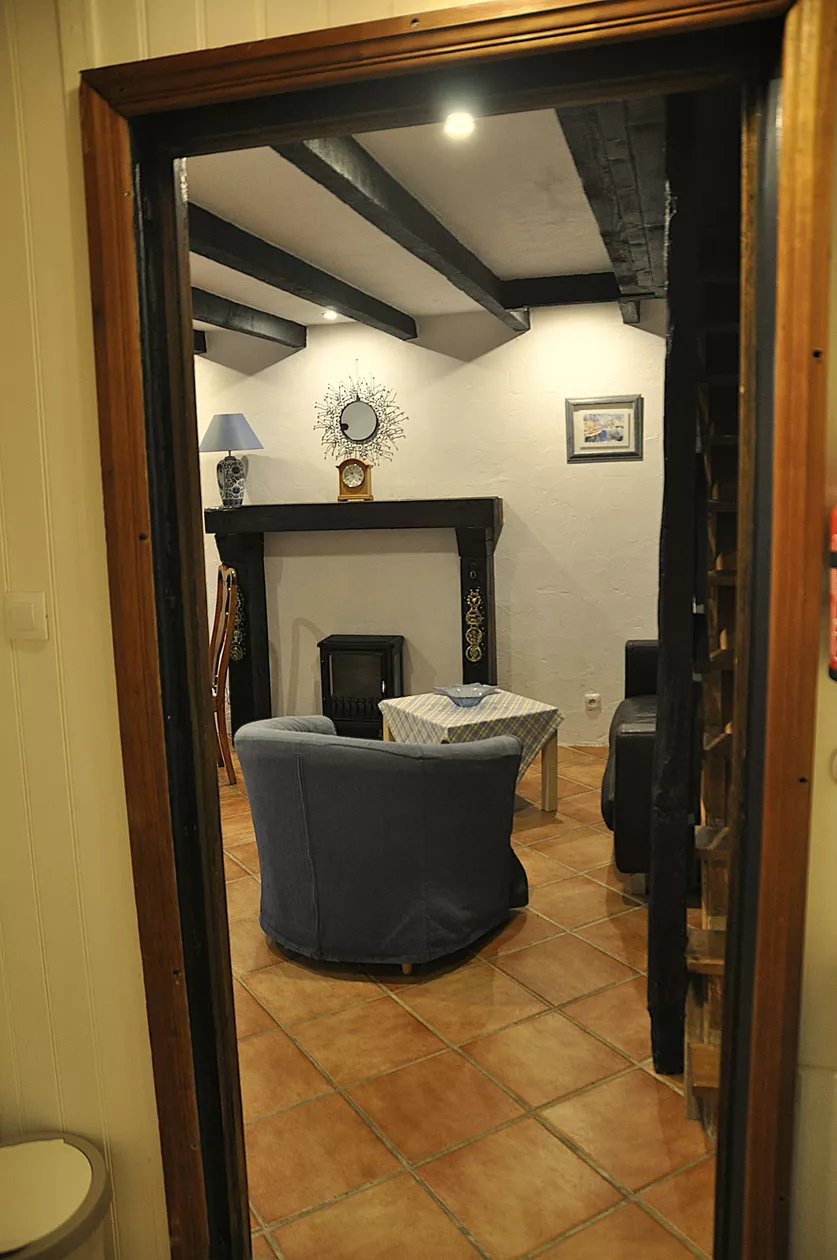 De comfortabele woon / eetkamer heeft een typisch Franse uitstraling met originele eiken balken, een massief eikenhouten vuuromlijsting en een houtkachel effect elektrische verwarming voor verblijven in het vroege / late seizoen.