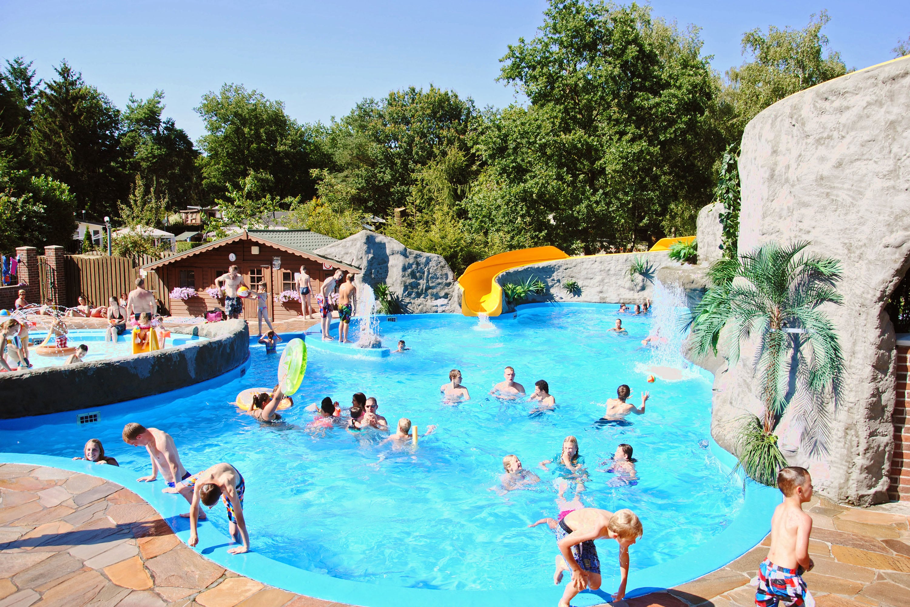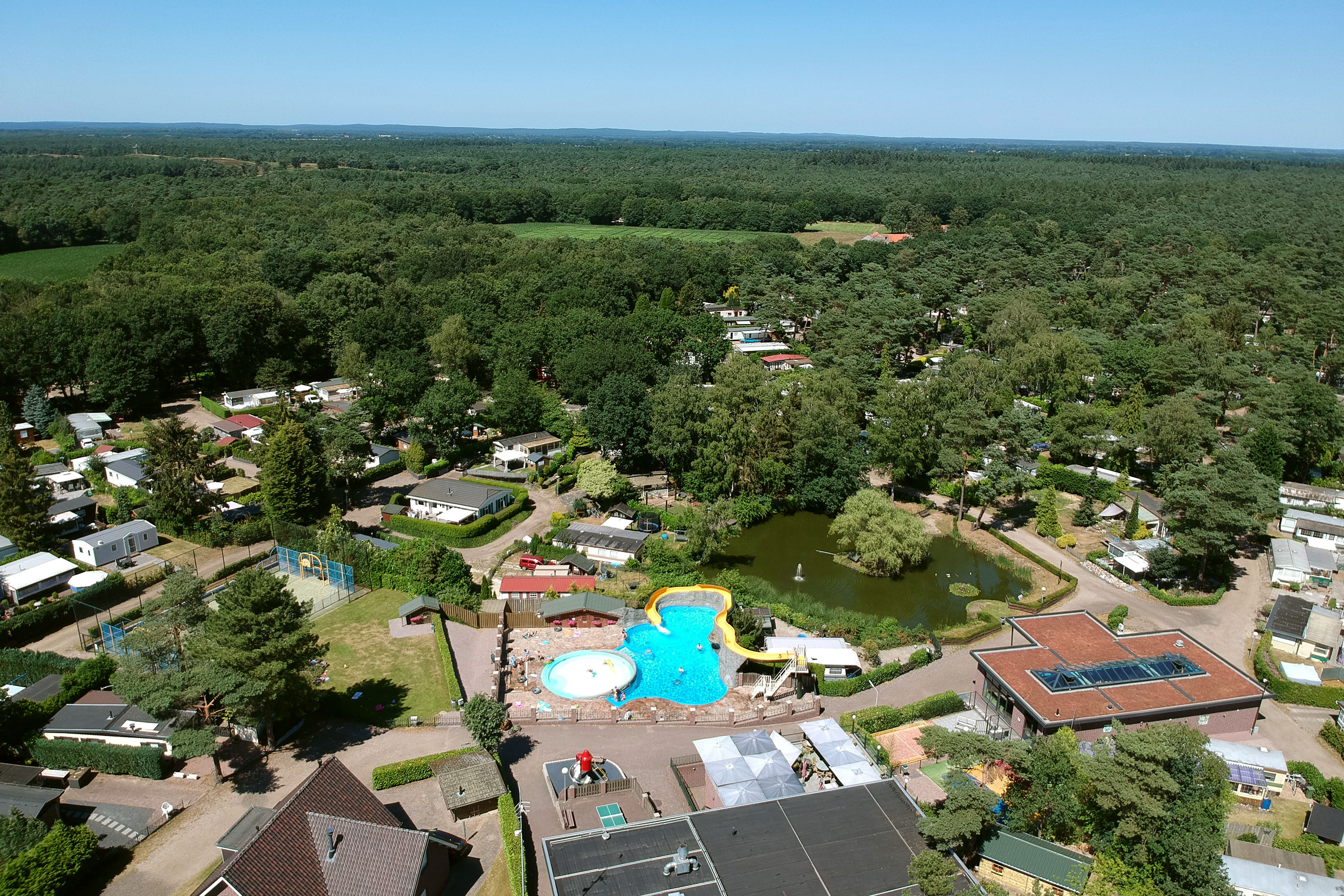 Zo beschikt het over verwarmde zwembaden met glijbanen en een mooie ligweide. Daarnaast kun je sporten op het pannaveld, de airtrampoline, het sportveld, de visvijver of golfbaan Bleijenbeek (op ca. 1 kilometer). In de avond zul je samen met het gezin plezier beleven bij de animatie, met een drankje op het panoramaterras of gewoon in jouw eigen accommodatie of kampeermiddel.