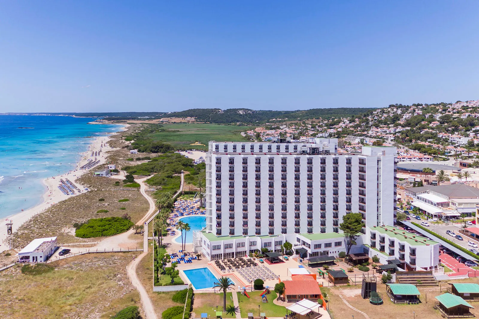 Het hotel ligt direct aan het prachtige zandstrand van Son Bou, één van de langste en meest geliefde stranden van Menorca. Dankzij de twee buitenzwembaden, een kinderzwembad en de leuke miniclub vervelen kinderen zich hier geenmoment. Voor volwassenen zijn er ook genoeg faciliteiten, zoals een fitnessruimte en meerdere bars om met een drankje te ontspannen. In de twee restaurants geniet je van gevarieerde maaltijden.