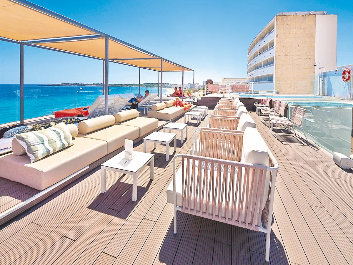 Het chill-out dakterras biedt een fantastisch uitzicht op de diepblauwe zee en is's avonds de perfecte plek voor een sundowner..