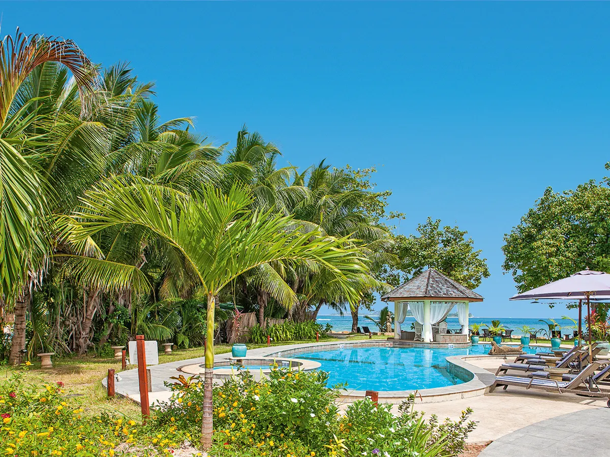 Op het fijne zandstrand van Anse Kerlan, omgeven door een tropische tuin en met een fantastisch uitzicht op de Indische Oceaan.