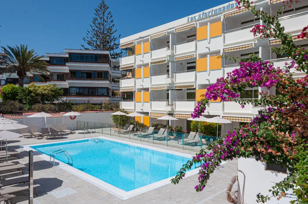 Het eenvoudige appartementencomplex Las Afortunadas biedt een rustig vakantie adres, maar is wel heel centraal gelegen in Playa del Ingles op Gran Canaria.