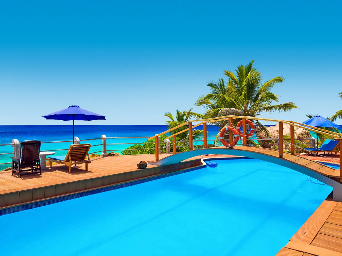 Dit rustig gelegen hotel ligt aan de romantische baai van Anse Patates en biedt een spectaculair uitzicht op de Indische Oceaan en offshore-eilanden.