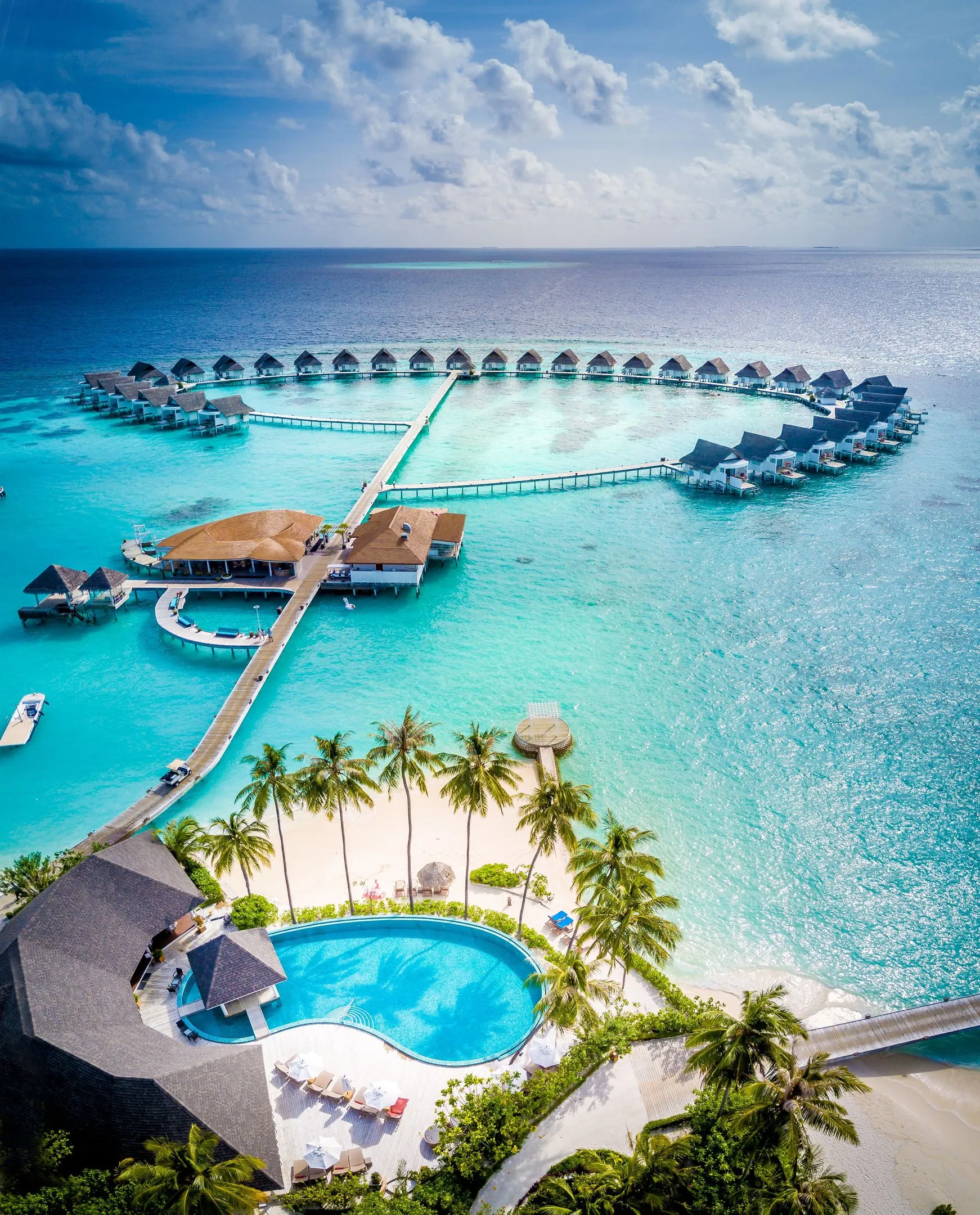 Het strandhotel begroet de gasten op het Ari-atol..