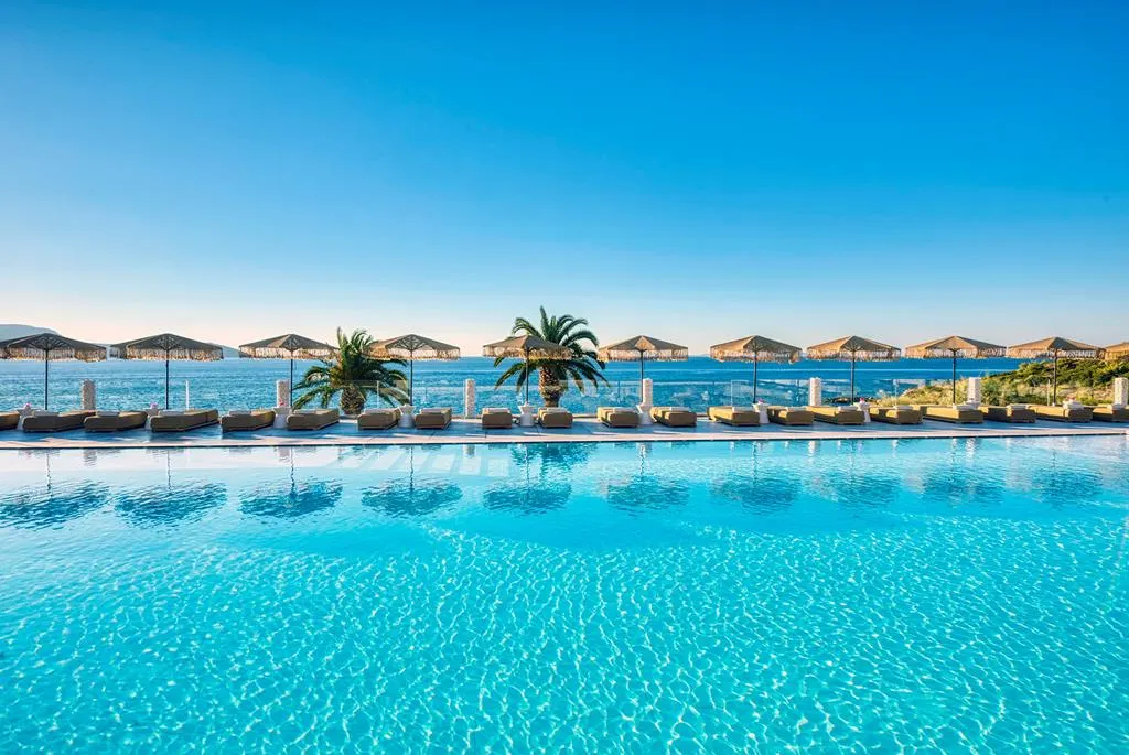 Op alle terrassen; aan het privéstrand, het spiegelgladde buitenzwembad en het Panorama restaurant, is het uitzicht over zee bijna te mooi om waar te zijn. Alle vakantiegangers zijn hier helemaal in hun element op een strandvakantie zonder kinderen. Een groep vrienden in de trendy Cavo Pountes Beach Club lacht om een studentengrap uit het verleden. Een knap stel komt als nieuw uit de Adam&Eve Spa.