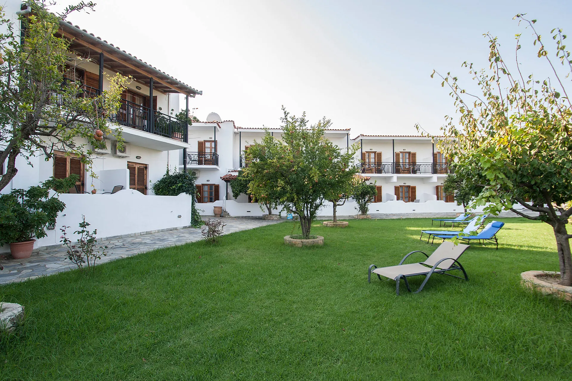 Het hotel ligt op slechts 50 m van het prachtige zandstrand van Achladies en is omgeven door weelderige rozentuin en palmbomen, wat zorgt voor een vredige en groene omgeving.