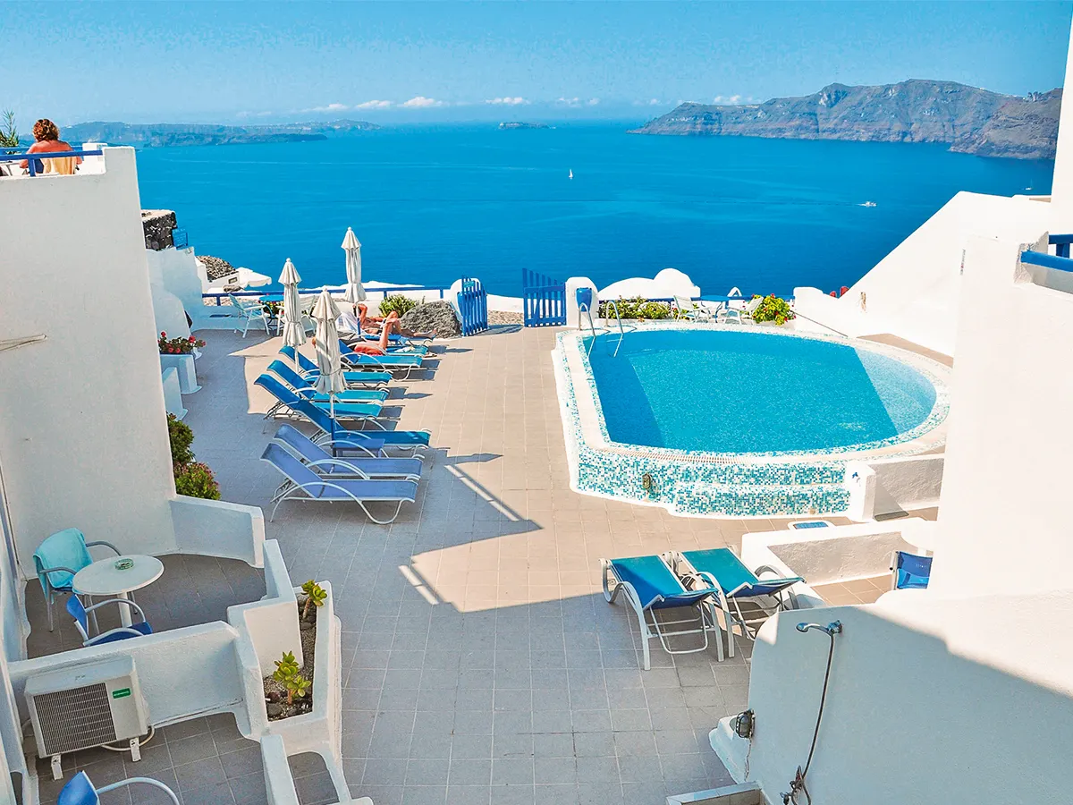Breng uw vakantie door in een unieke sfeer en een fantastische achtergrond! Geniet van een spectaculair uitzicht over de Caldera van dit hotel, gebouwd in de typische Cycladische stijl.