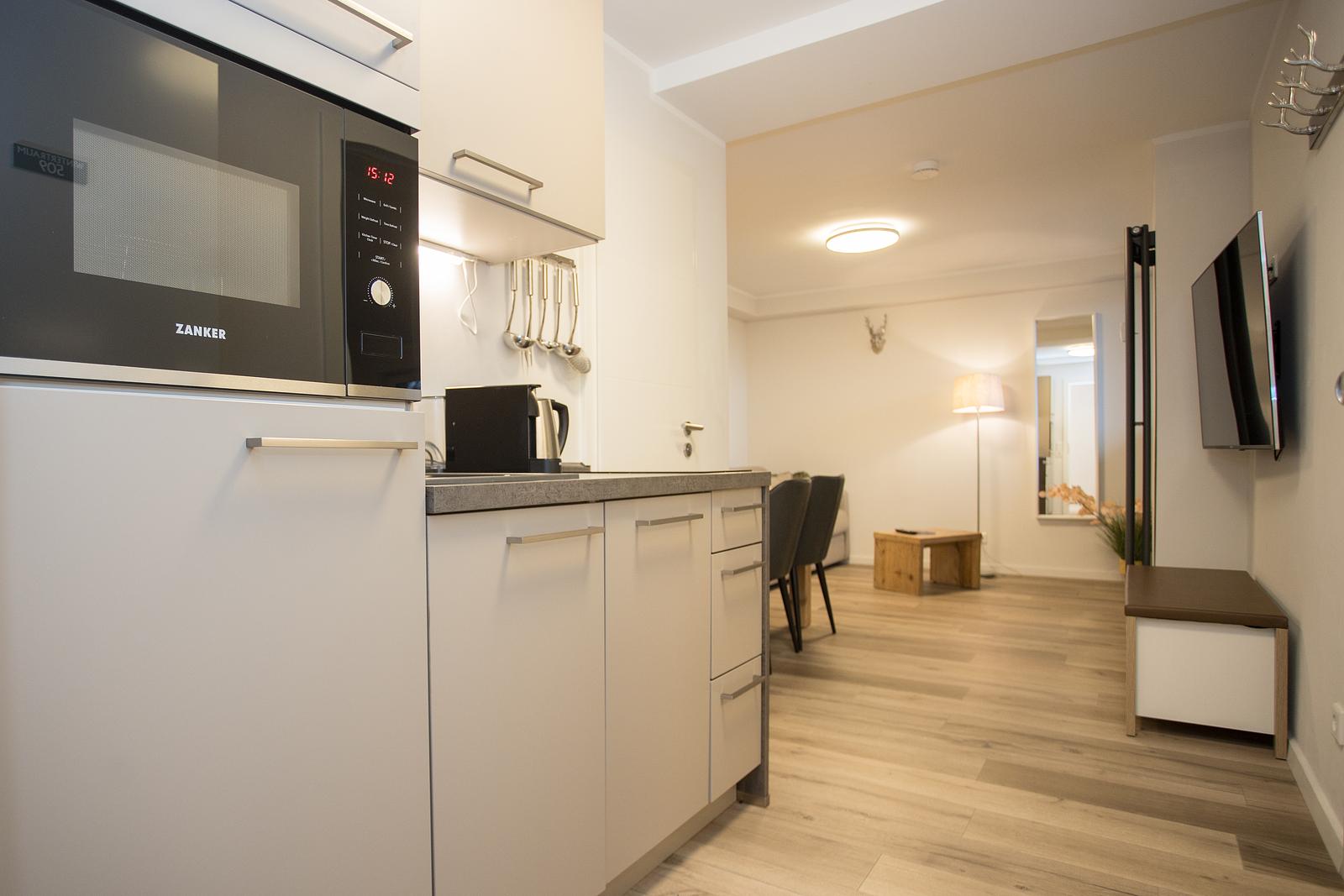 In de lichte woonkamer staat een comfortabele (slaap)bank bij de televisie. Naast het zitgedeelte vind je de eettafel met ruimte voor vier personen. De keuken heeft veel opbergruimte en bevat alles wat je nodig hebt. Voorzien van een inductiekookplaat, combi-magnetron, vaatwasser, koelkast met vriesvakje, broodrooster, waterkoker en nespresso koffiezetapparaat heb je alles in huis om je maaltijden te bereiden. De slaapkamer met een tweepersoonsbed (2x matras 90x200cm) grenst aan de keuken. Hier kan je heerlijk vanuit je bed nog even televisie kijken want in de slaapkamer hangt een tweede tv.